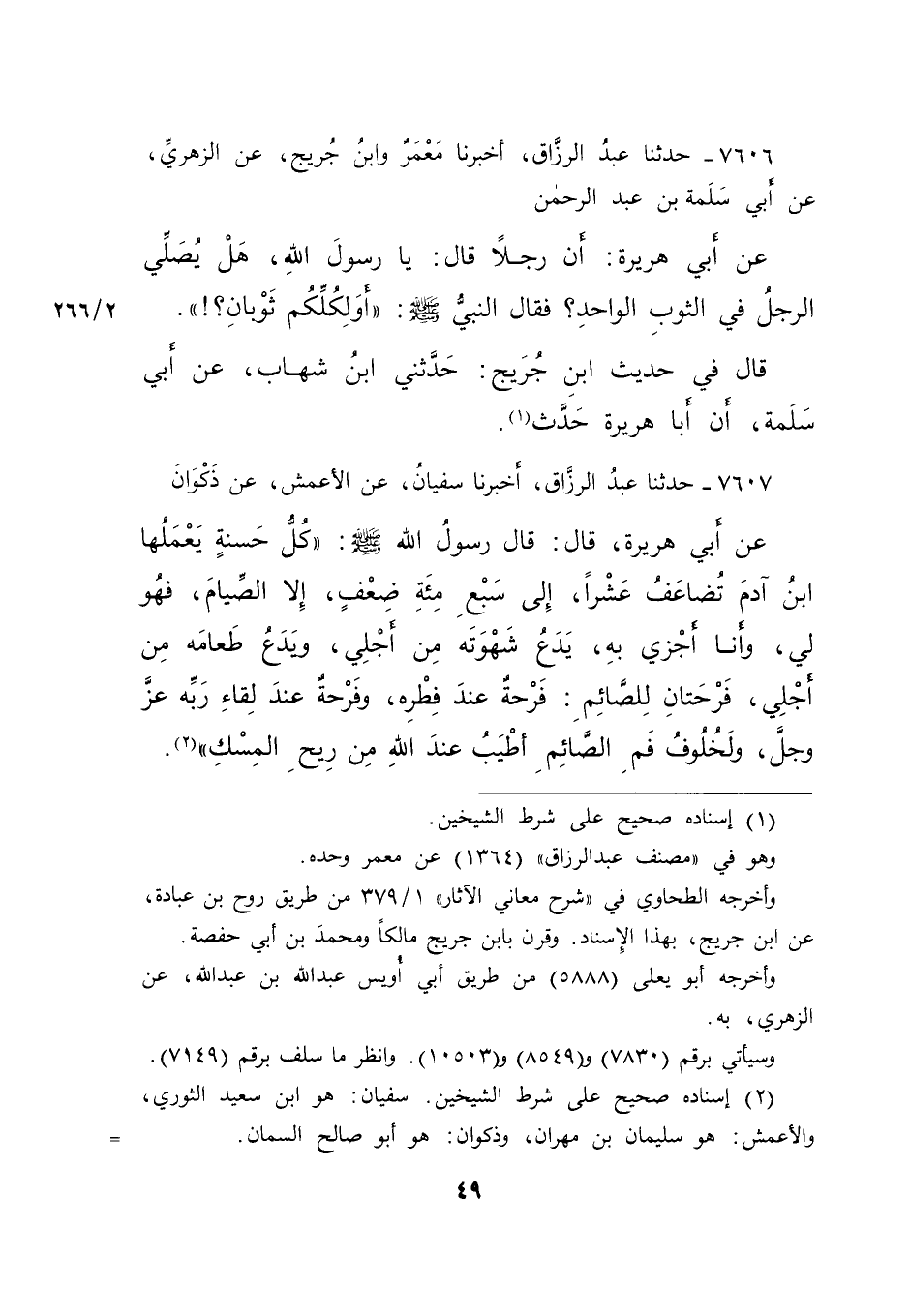 ٧٦٠٦ - حَدَّثَنَا عَبْدُ الرَّزَّاقِ، أَخْبَرَنَا مَعْمَرٌ، وَابْنُ جُرَيْجٍ، عَنِ الزُّهْرِيِّ، عَنْ أَبِي سَلَمَةَ بْنِ عَبْدِ الرَّحْمَنِ، عَنْ أَبِي هُرَيْرَةَ: أَنَّ رَجُلًا قَالَ: يَا رَسُولَ اللهِ، هَلْ يُصَلِّي الرَّجُلُ فِي الثَّوْبِ الْوَاحِدِ؟ فَقَالَ النَّبِيُّ صَلَّى اللهُ عَلَيْهِ وَسَلَّمَ: " أَوَلِكُلِّكُمْ ثَوْبَانِ؟ " قَالَ فِي حَدِيثِ ابْنِ جُرَيْجٍ: حَدَّثَنِي ابْنُ شِهَابٍ، عَنْ أَبِي سَلَمَةَ، أَنَّ أَبَا هُرَيْرَةَ، حَدَّثَ (١)