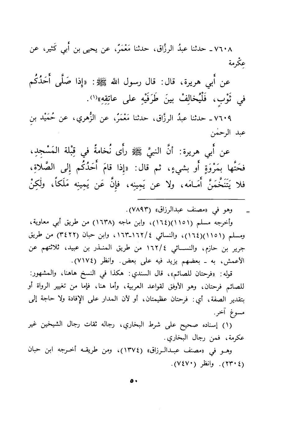 ٧٦٠٩ - حَدَّثَنَا عَبْدُ الرَّزَّاقِ، حَدَّثَنَا مَعْمَرٌ، عَنِ الزُّهْرِيِّ، عَنْ حُمَيْدِ بْنِ عَبْدِ الرَّحْمَنِ، عَنْ أَبِي هُرَيْرَةَ، أَنَّ النَّبِيَّ صَلَّى اللهُ عَلَيْهِ وَسَلَّمَ رَأَى نُخَامَةً فِي قِبْلَةِ الْمَسْجِدِ، فَحَتَّهَا بِمَرْوَةٍ أَوْ بِشَيْءٍ، ثُمَّ قَالَ: " إِذَا قَامَ أَحَدُكُمْ إِلَى الصَّلَاةِ، فَلَا يَتَنَخَّمَنَّ أَمَامَهُ، وَلَا عَنْ يَمِينِهِ، فَإِنَّ عَنْ يَمِينِهِ مَلَكًا، وَلَكِنْ