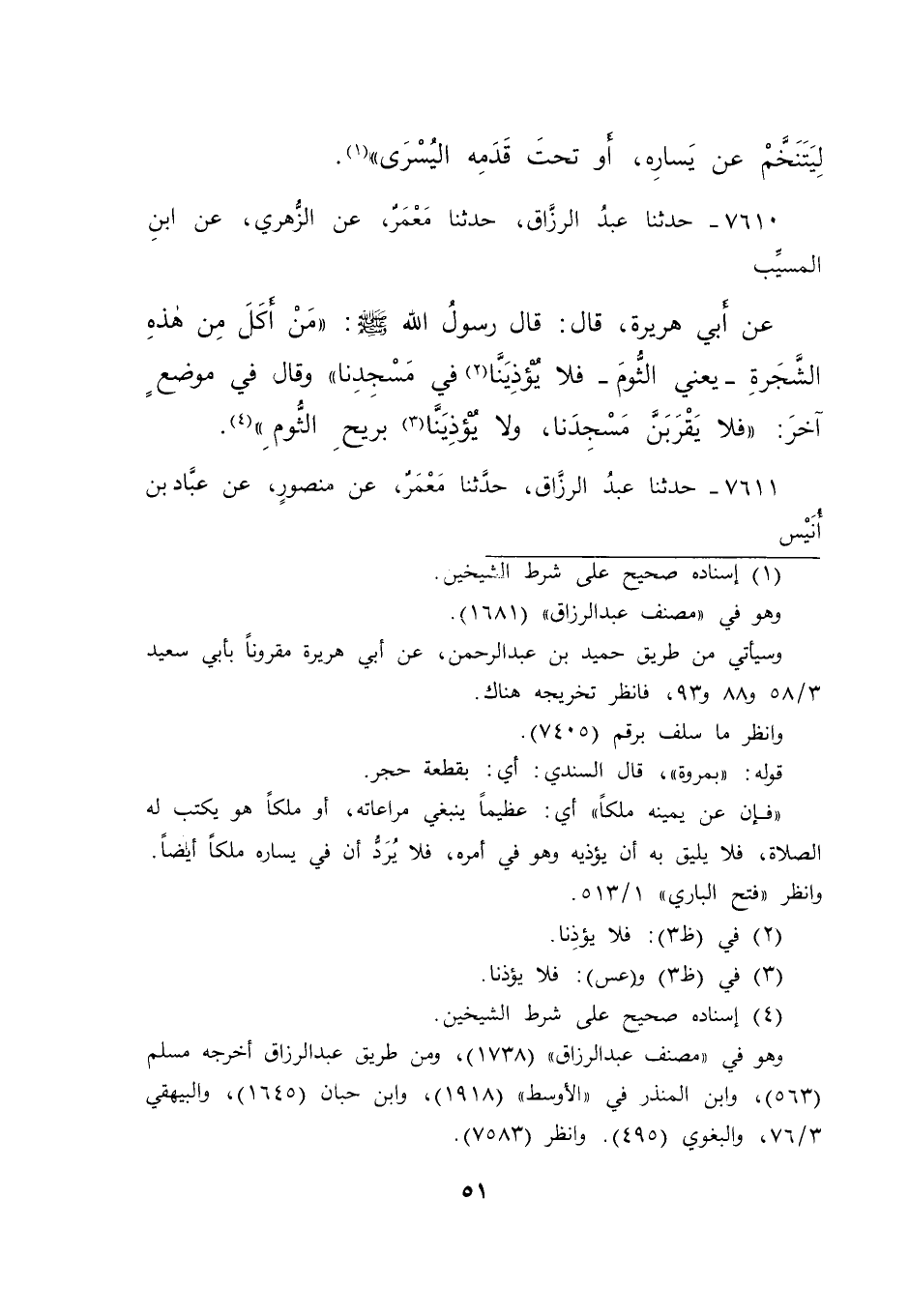 ٧٦١٠ - حَدَّثَنَا عَبْدُ الرَّزَّاقِ، حَدَّثَنَا مَعْمَرٌ، عَنِ الزُّهْرِيِّ، عَنِ ابْنِ الْمُسَيَّبِ، عَنْ أَبِي هُرَيْرَةَ، قَالَ: قَالَ رَسُولُ اللهِ صَلَّى اللهُ عَلَيْهِ وَسَلَّمَ: " مَنْ أَكَلَ مِنْ هَذِهِ الشَّجَرَةِ - يَعْنِي الثُّومَ - فَلَا يُؤْذِينَا (٢) فِي مَسْجِدِنَا " وَقَالَ فِي مَوْضِعٍ آخَرَ: " فَلَا يَقْرَبَنَّ مَسْجِدَنَا، وَلَا يُؤْذِينَا (٣) بِرِيحِ الثُّومِ " (٤)