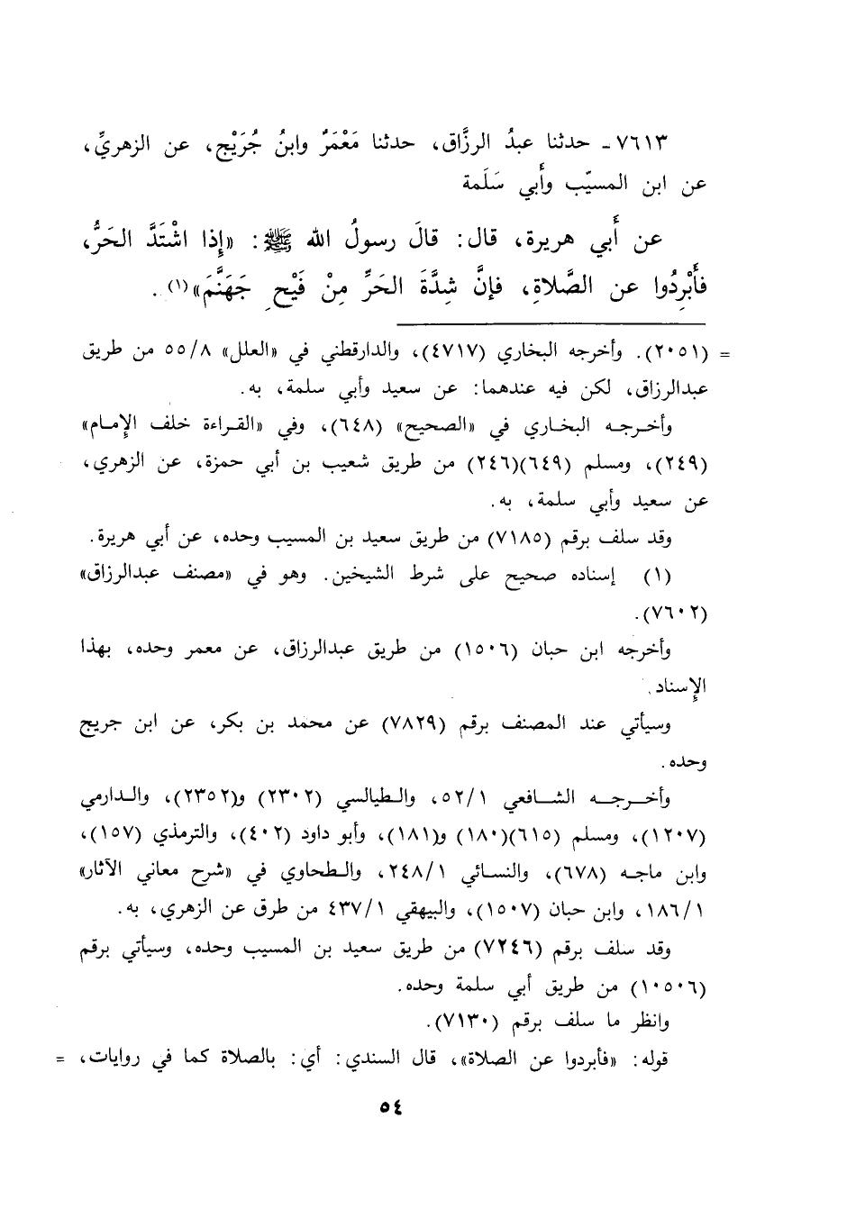 ٧٦١٣ - حَدَّثَنَا عَبْدُ الرَّزَّاقِ، حَدَّثَنَا مَعْمَرٌ، وَابْنُ جُرَيْجٍ، عَنِ الزُّهْرِيِّ، عَنِ ابْنِ الْمُسَيِّبِ، وَأَبِي سَلَمَةَ، عَنْ أَبِي هُرَيْرَةَ، قَالَ: قَالَ رَسُولُ اللهِ صَلَّى اللهُ عَلَيْهِ وَسَلَّمَ: " إِذَا اشْتَدَّ الْحَرُّ، فَأَبْرِدُوا عَنِ الصَّلَاةِ، فَإِنَّ شِدَّةَ الْحَرِّ مِنْ فَيْحِ جَهَنَّمَ " (١)