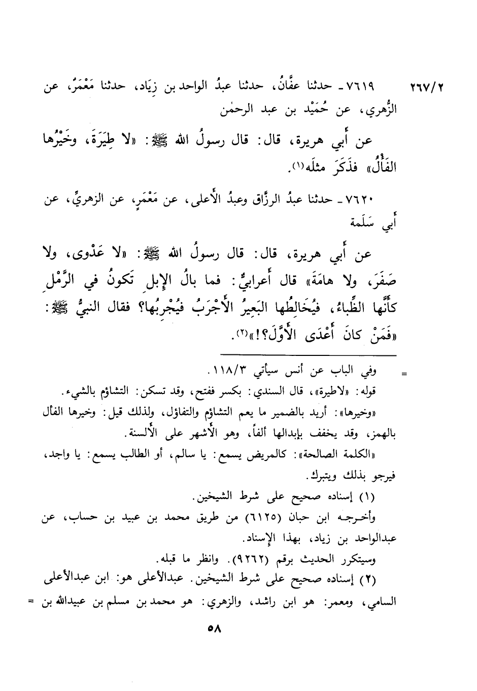 ٧٦١٩ - حَدَّثَنَا عَفَّانُ، حَدَّثَنَا عَبْدُ الْوَاحِدِ بْنُ زِيَادٍ، حَدَّثَنَا مَعْمَرٌ، عَنِ الزُّهْرِيِّ، عَنْ حُمَيْدِ بْنِ عَبْدِ الرَّحْمَنِ، عَنْ أَبِي هُرَيْرَةَ، قَالَ: قَالَ رَسُولُ اللهِ صَلَّى اللهُ عَلَيْهِ وَسَلَّمَ: " لَا طِيَرَةَ، وَخَيْرُهَا الْفَأْلُ " فَذَكَرَ مِثْلَهُ (١)