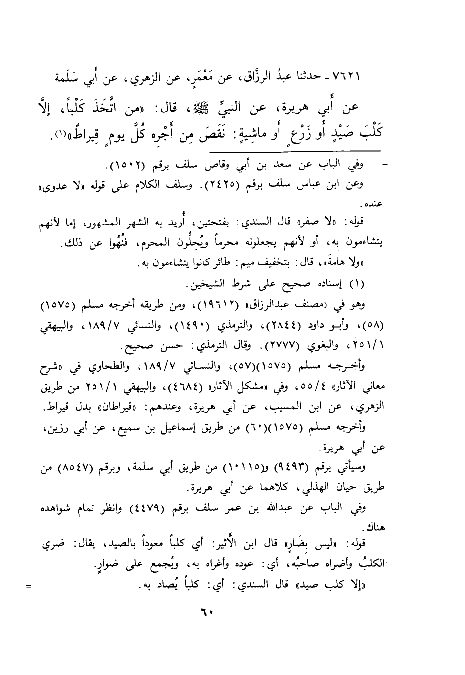 ٧٦٢١ - حَدَّثَنَا عَبْدُ الرَّزَّاقِ، عَنْ مَعْمَرٍ، عَنِ الزُّهْرِيِّ، عَنْ أَبِي سَلَمَةَ، عَنْ أَبِي هُرَيْرَةَ، عَنِ النَّبِيِّ صَلَّى اللهُ عَلَيْهِ وَسَلَّمَ قَالَ: " مَنِ اتَّخَذَ كَلْبًا، إِلَّا كَلْبَ صَيْدٍ أَوْ زَرْعٍ أَوْ مَاشِيَةٍ: نَقَصَ مِنْ أَجْرِهِ كُلَّ يَوْمٍ قِيرَاطٌ " (١)