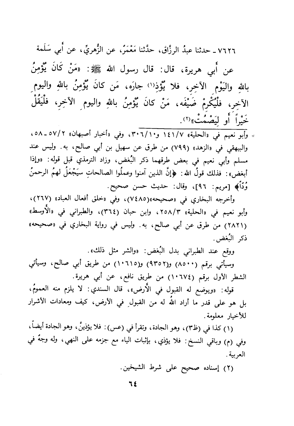 ٧٦٢٦ - حَدَّثَنَا عَبْدُ الرَّزَّاقِ، حَدَّثَنَا مَعْمَرٌ، عَنِ الزُّهْرِيِّ، عَنْ أَبِي سَلَمَةَ، عَنْ أَبِي هُرَيْرَةَ، قَالَ: قَالَ رَسُولُ اللهِ صَلَّى اللهُ عَلَيْهِ وَسَلَّمَ: " مَنْ كَانَ يُؤْمِنُ بِاللهِ وَالْيَوْمِ الْآخِرِ، فَلَا يُؤْذِ (١) جَارَهُ، مَنْ كَانَ يُؤْمِنُ بِاللهِ وَالْيَوْمِ الْآخِرِ، فَلْيُكْرِمْ ضَيْفَهُ، مَنْ كَانَ يُؤْمِنُ بِاللهِ وَالْيَوْمِ الْآخِرِ، فَلْيَقُلْ خَيْرًا أَوْ لِيَصْمُتْ " (٢)