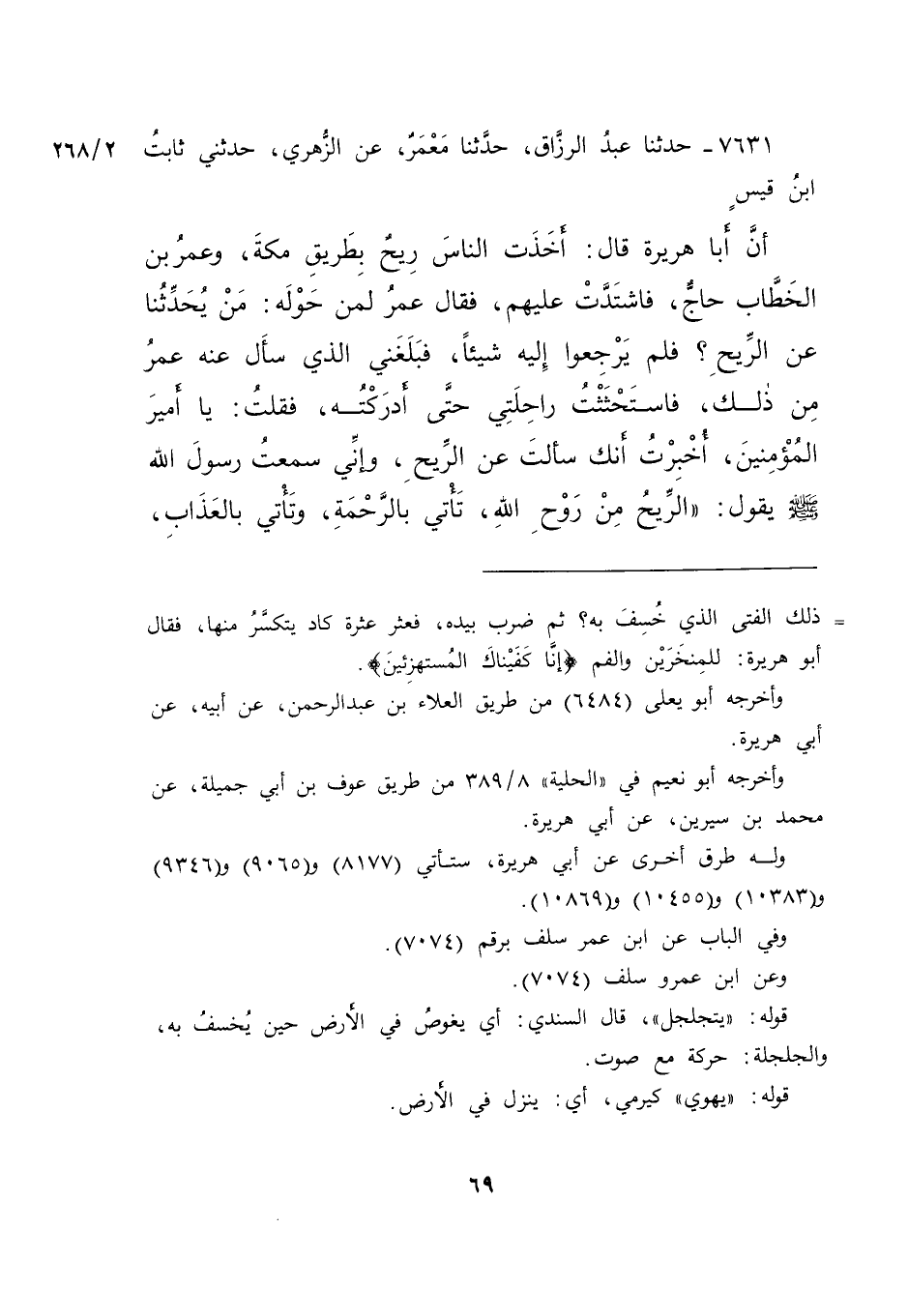٧٦٣١ - حَدَّثَنَا عَبْدُ الرَّزَّاقِ، حَدَّثَنَا مَعْمَرٌ، عَنِ الزُّهْرِيِّ، حَدَّثَنِي ثَابِتُ بْنُ قَيْسٍ، أَنَّ أَبَا هُرَيْرَةَ، قَالَ: أَخَذَتِ النَّاسَ رِيحٌ بِطَرِيقِ مَكَّةَ، وَعُمَرُ بْنُ الْخَطَّابِ حَاجٌّ، فَاشْتَدَّتْ عَلَيْهِمْ، فَقَالَ عُمَرُ لِمَنْ حَوْلَهُ: مَنْ يُحَدِّثُنَا عَنِ الرِّيحِ؟ فَلَمْ يُرْجِعُوا إِلَيْهِ شَيْئًا، فَبَلَغَنِي الَّذِي سَأَلَ عَنْهُ عُمَرُ مِنْ ذَلِكَ، فَاسْتَحْثَثْتُ رَاحِلَتِي حَتَّى أَدْرَكْتُهُ، فَقُلْتُ: يَا أَمِيرَ الْمُؤْمِنِينَ، أُخْبِرْتُ أَنَّكَ سَأَلْتَ عَنِ الرِّيحِ، وَإِنِّي سَمِعْتُ رَسُولَ اللهِ صَلَّى اللهُ عَلَيْهِ وَسَلَّمَ يَقُولُ: " الرِّيحُ مِنْ رَوْحِ اللهِ، تَأْتِي بِالرَّحْمَةِ، وَتَأْتِي بِالْعَذَابِ