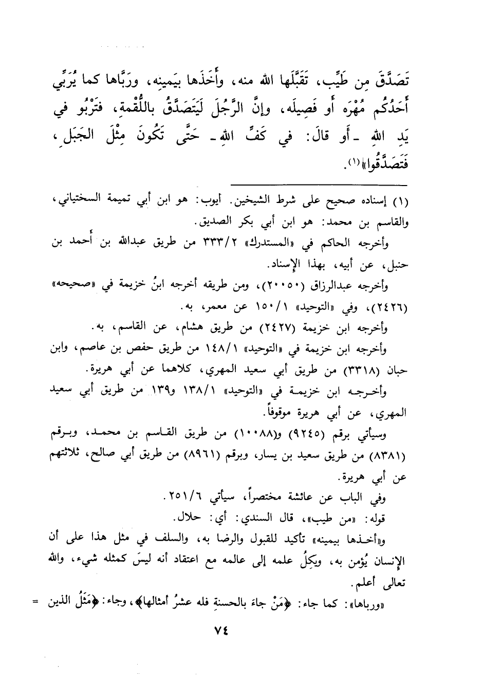 تَصَدَّقَ مِنْ طَيِّبٍ، تَقَبَّلَهَا اللهُ مِنْهُ، وَأَخَذَهَا بِيَمِينِهِ، وَرَبَّاهَا كَمَا يُرَبِّي أَحَدُكُمْ مُهْرَهُ أَوْ فَصِيلَهُ، وَإِنَّ الرَّجُلَ لَيَتَصَدَّقُ بِاللُّقْمَةِ، فَتَرْبُو فِي يَدِ اللهِ - أَوْ قَالَ: فِي كَفِّ اللهِ - حَتَّى تَكُونَ مِثْلَ الْجَبَلِ، فَتَصَدَّقُوا " (١)