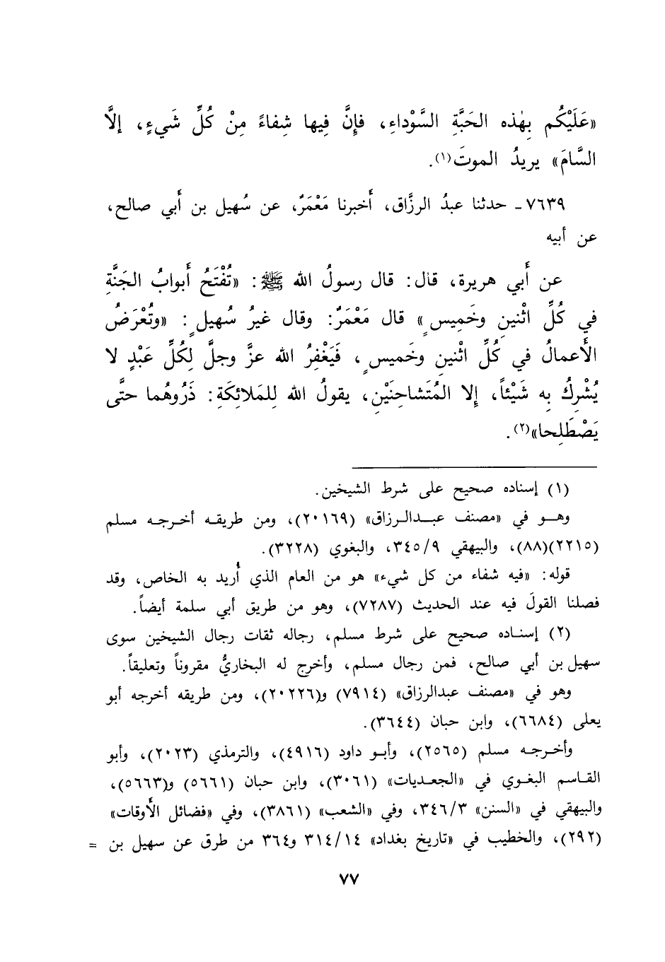 ٧٦٣٩ - حَدَّثَنَا عَبْدُ الرَّزَّاقِ، أَخْبَرَنَا مَعْمَرٌ، عَنْ سُهَيْلِ بْنِ أَبِي صَالِحٍ، عَنْ أَبِيهِ، عَنْ أَبِي هُرَيْرَةَ، قَالَ: قَالَ رَسُولُ اللهِ صَلَّى اللهُ عَلَيْهِ وَسَلَّمَ: " تُفْتَحُ أَبْوَابُ الْجَنَّةِ فِي كُلِّ اثْنَيْنِ وَخَمِيسٍ - قَالَ مَعْمَرٌ: وَقَالَ غَيْرُ سُهَيْلٍ - وَتُعْرَضُ الْأَعْمَالُ فِي كُلِّ اثْنَيْنِ وَخَمِيسٍ، فَيَغْفِرُ اللهُ عَزَّ وَجَلَّ لِكُلِّ عَبْدٍ لَا يُشْرِكُ بِهِ شَيْئًا، إِلَّا الْمُتَشَاحِنَيْنِ، يَقُولُ اللهُ لِلْمَلَائِكَةِ: ذَرُوهُمَا حَتَّى يَصْطَلِحَا " (٢)