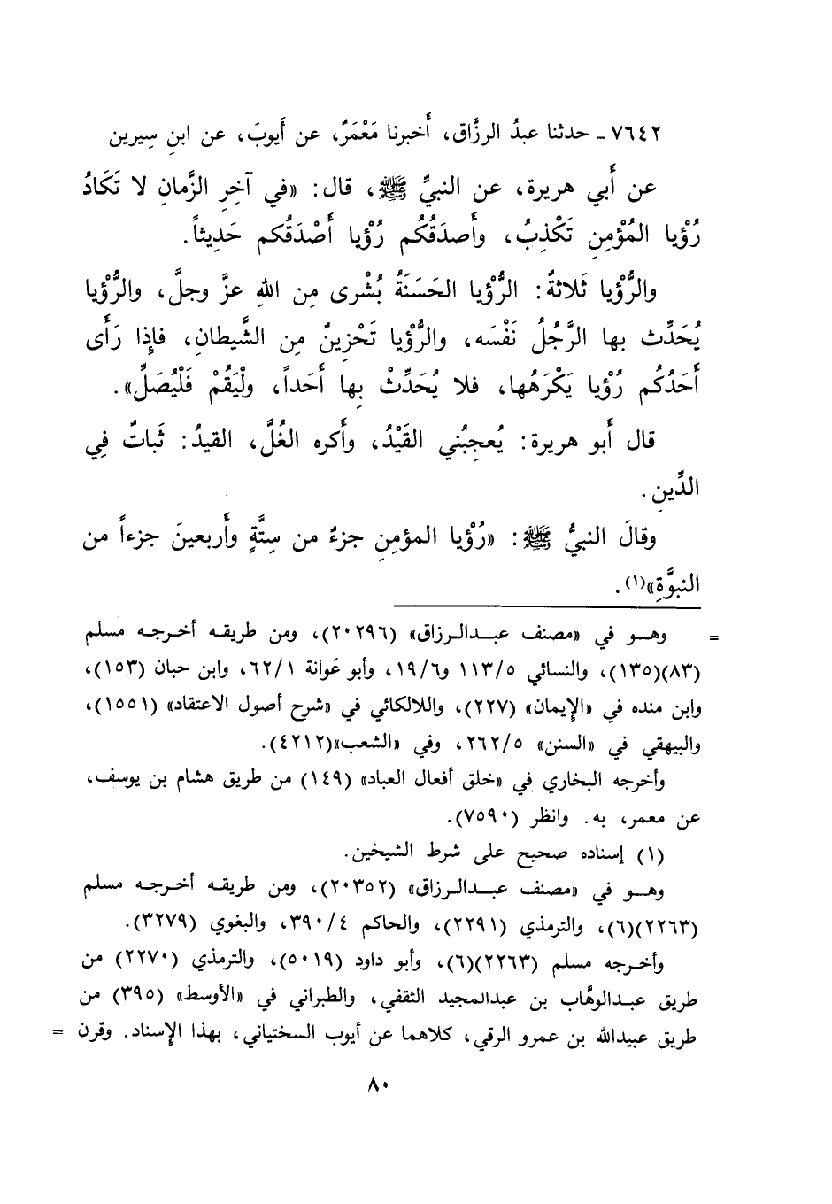 ٧٦٤٢ - حَدَّثَنَا عَبْدُ الرَّزَّاقِ، أَخْبَرَنَا مَعْمَرٌ، عَنْ أَيُّوبَ، عَنِ ابْنِ سِيرِينَ، عَنْ أَبِي هُرَيْرَةَ، عَنِ النَّبِيِّ صَلَّى اللهُ عَلَيْهِ وَسَلَّمَ قَالَ: " فِي آخِرِ الزَّمَانِ لَا تَكَادُ رُؤْيَا الْمُؤْمِنِ تَكْذِبُ، وَأَصْدَقُكُمْ رُؤْيَا أَصْدَقُكُمْ حَدِيثًا. وَالرُّؤْيَا ثَلَاثَةٌ: الرُّؤْيَا الْحَسَنَةُ بُشْرَى مِنَ اللهِ عَزَّ وَجَلَّ، وَالرُّؤْيَا يُحَدِّثُ بِهَا الرَّجُلُ نَفْسَهُ، وَالرُّؤْيَا تَحْزِينٌ مِنَ الشَّيْطَانِ، فَإِذَا رَأَى أَحَدُكُمْ رُؤْيَا يَكْرَهُهَا، فَلَا يُحَدِّثْ بِهَا أَحَدًا، وَلْيَقُمْ فَلْيُصَلِّ " قَالَ أَبُو هُرَيْرَةَ: " يُعْجِبُنِي الْقَيْدُ، وَأَكْرَهُ الْغُلَّ، الْقَيْدُ: ثَبَاتٌ فِي الدِّينِ "