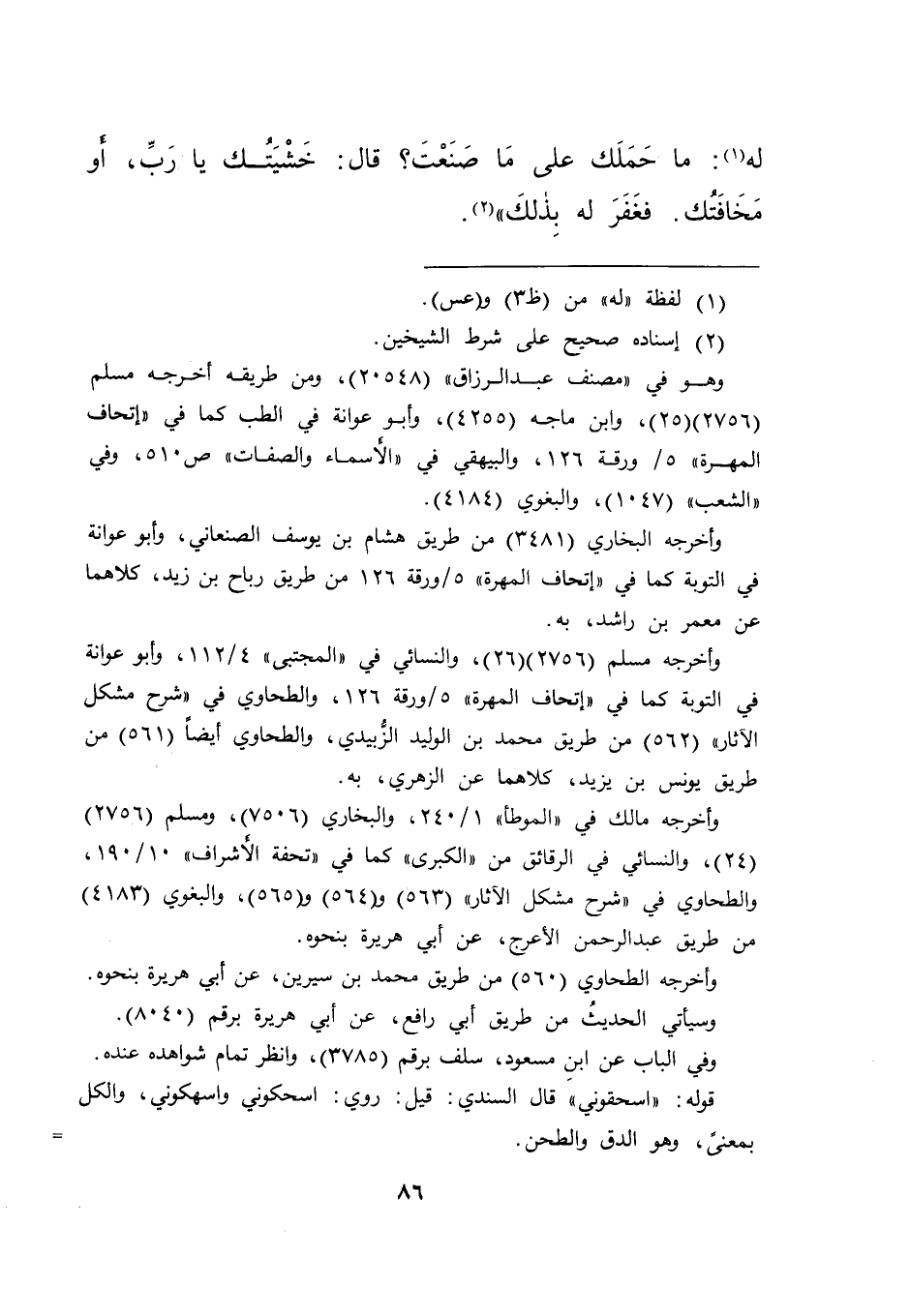 لَهُ (١) : مَا حَمَلَكَ عَلَى مَا صَنَعْتَ؟ قَالَ: خَشْيَتُكَ يَا رَبِّ، أَوْ مَخَافَتُكَ. فَغَفَرَ لَهُ بِذَلِكَ " (٢)