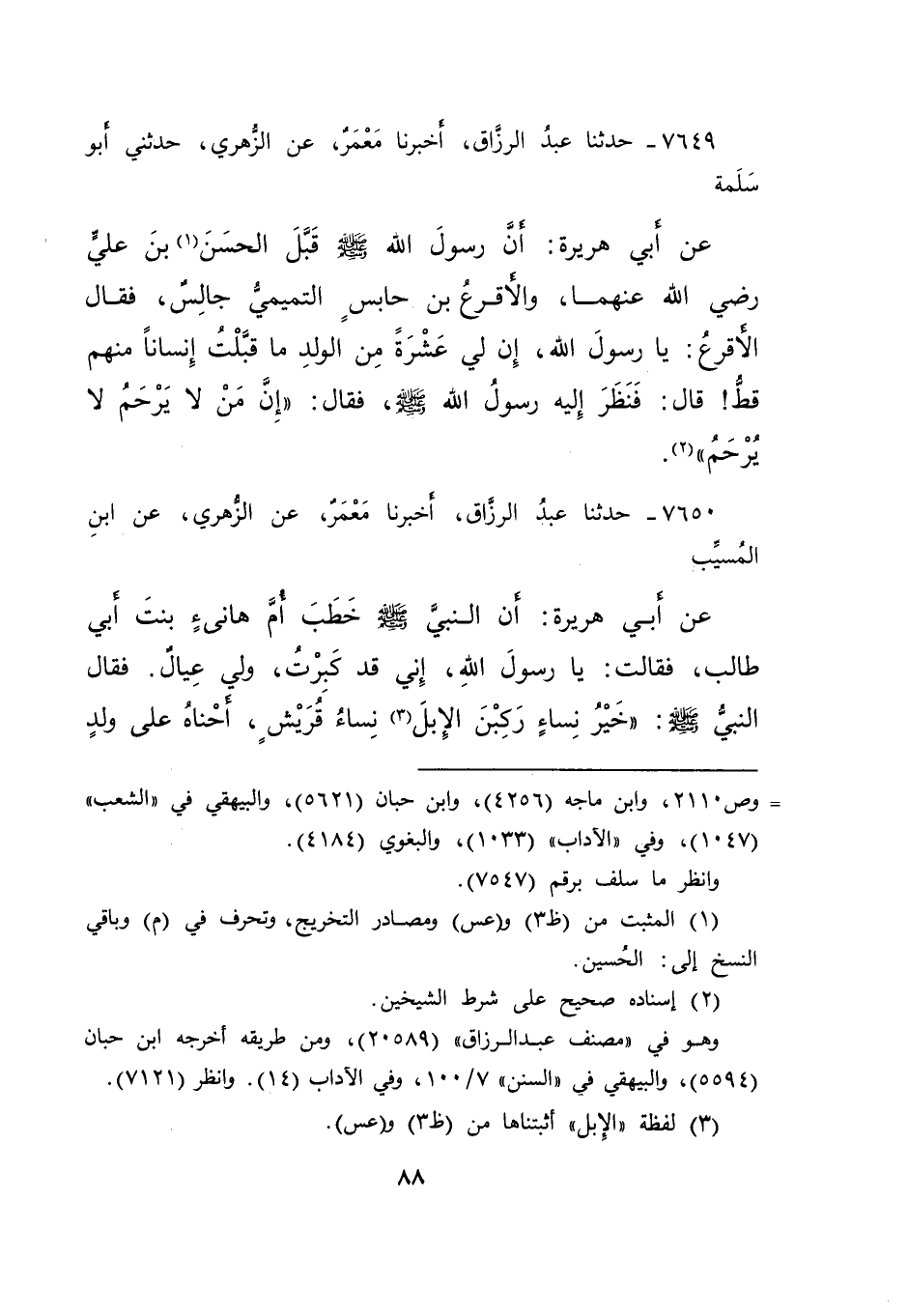 ٧٦٤٩ - حَدَّثَنَا عَبْدُ الرَّزَّاقِ، أَخْبَرَنَا مَعْمَرٌ، عَنِ الزُّهْرِيِّ، حَدَّثَنِي أَبُو سَلَمَةَ، عَنْ أَبِي هُرَيْرَةَ، أَنَّ رَسُولَ اللهِ صَلَّى اللهُ عَلَيْهِ وَسَلَّمَ قَبَّلَ الْحَسَنَ (١) بْنَ عَلِيٍّ رَضِيَ اللهُ عَنْهُمَا، وَالْأَقْرَعُ بْنُ حَابِسٍ التَّمِيمِيُّ جَالِسٌ، فَقَالَ الْأَقْرَعُ: يَا رَسُولَ اللهِ، إِنَّ لِي عَشَرَةً مِنَ الْوَلَدِ مَا قَبَّلْتُ إِنْسَانًا مِنْهُمْ قَطُّ قَالَ: فَنَظَرَ إِلَيْهِ رَسُولُ اللهِ صَلَّى اللهُ عَلَيْهِ وَسَلَّمَ، فَقَالَ: " إِنَّ مَنْ لَا يَرْحَمُ لَا يُرْحَمُ " (٢)