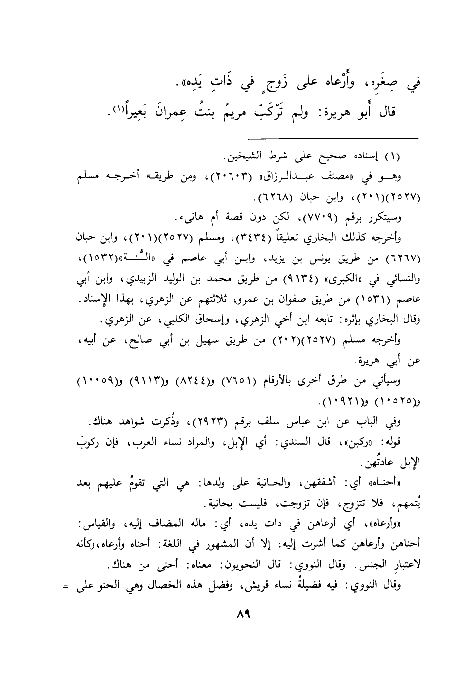 فِي صِغَرِهِ، وَأَرْعَاهُ عَلَى زَوْجٍ فِي ذَاتِ يَدِهِ " قَالَ أَبُو هُرَيْرَةَ: " وَلَمْ تَرْكَبْ مَرْيَمُ بِنْتُ عِمْرَانَ بَعِيرًا " (١)