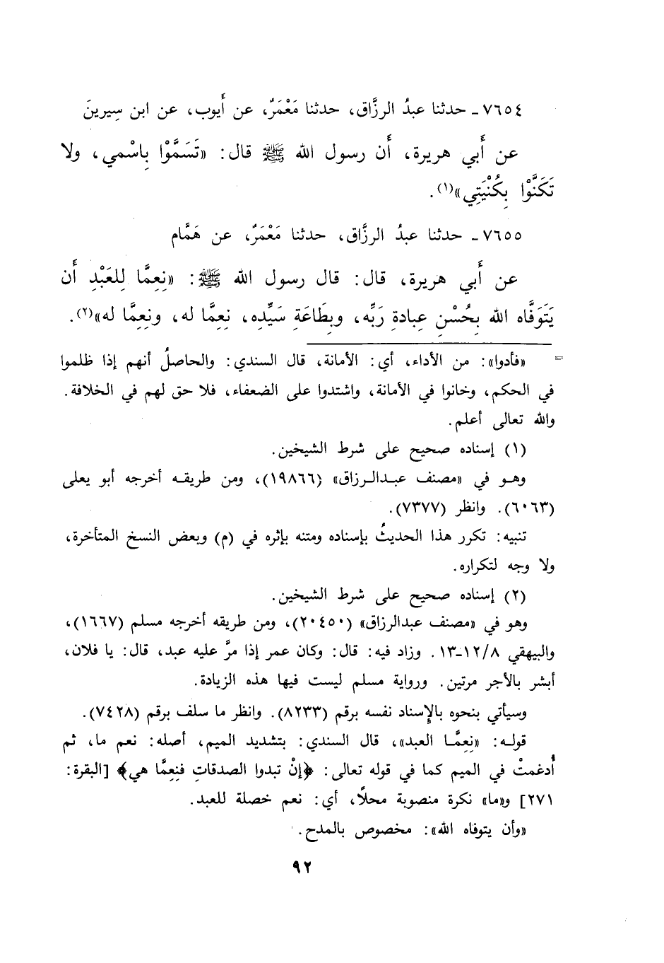 ٧٦٥٥ - حَدَّثَنَا عَبْدُ الرَّزَّاقِ، حَدَّثَنَا مَعْمَرٌ، عَنْ هَمَّامٍ، عَنْ أَبِي هُرَيْرَةَ، قَالَ: قَالَ رَسُولُ اللهِ صَلَّى اللهُ عَلَيْهِ وَسَلَّمَ: " نِعِمَّا لِلْعَبْدِ أَنْ يَتَوَفَّاهُ اللهُ بِحُسْنِ عِبَادَةِ رَبِّهِ، وَبِطَاعَةِ سَيِّدِهِ، نِعِمَّا لَهُ، وَنِعِمَّا لَهُ " (٢)