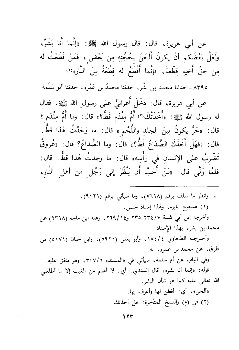 عَنْ أَبِي هُرَيْرَةَ، قَالَ: قَالَ رَسُولُ اللهِ صَلَّى اللهُ عَلَيْهِ وَسَلَّمَ: " إِنَّمَا أَنَا بَشَرٌ، وَلَعَلَّ بَعْضَكُمْ أَنْ يَكُونَ أَلْحَنَ بِحُجَّتِهِ مِنْ بَعْضٍ، فَمَنْ قَطَعْتُ لَهُ مِنْ حَقِّ أَخِيهِ قِطْعَةً، فَإِنَّمَا أَقْطَعُ لَهُ قِطْعَةً مِنَ النَّارِ " (١)