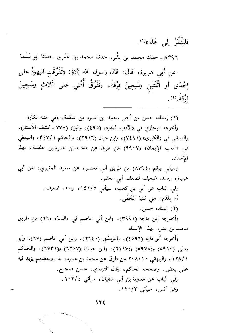 ٨٣٩٦ - حَدَّثَنَا مُحَمَّدُ بْنُ بِشْرٍ , حَدَّثَنَا مُحَمَّدُ بْنُ عَمْرٍو , حَدَّثَنَا أَبُو سَلَمَةَ، عَنْ أَبِي هُرَيْرَةَ، قَالَ: قَالَ رَسُولُ اللهِ صَلَّى اللهُ عَلَيْهِ وَسَلَّمَ: " تَفَرَّقَتِ الْيَهُودُ عَلَى إِحْدَى، أَوِ اثْنَتَيْنِ وَسَبْعِينَ فِرْقَةً، وَتَفَرَّقُ أُمَّتِي عَلَى ثَلَاثٍ وَسَبْعِينَ فِرْقَةً " (٢)
