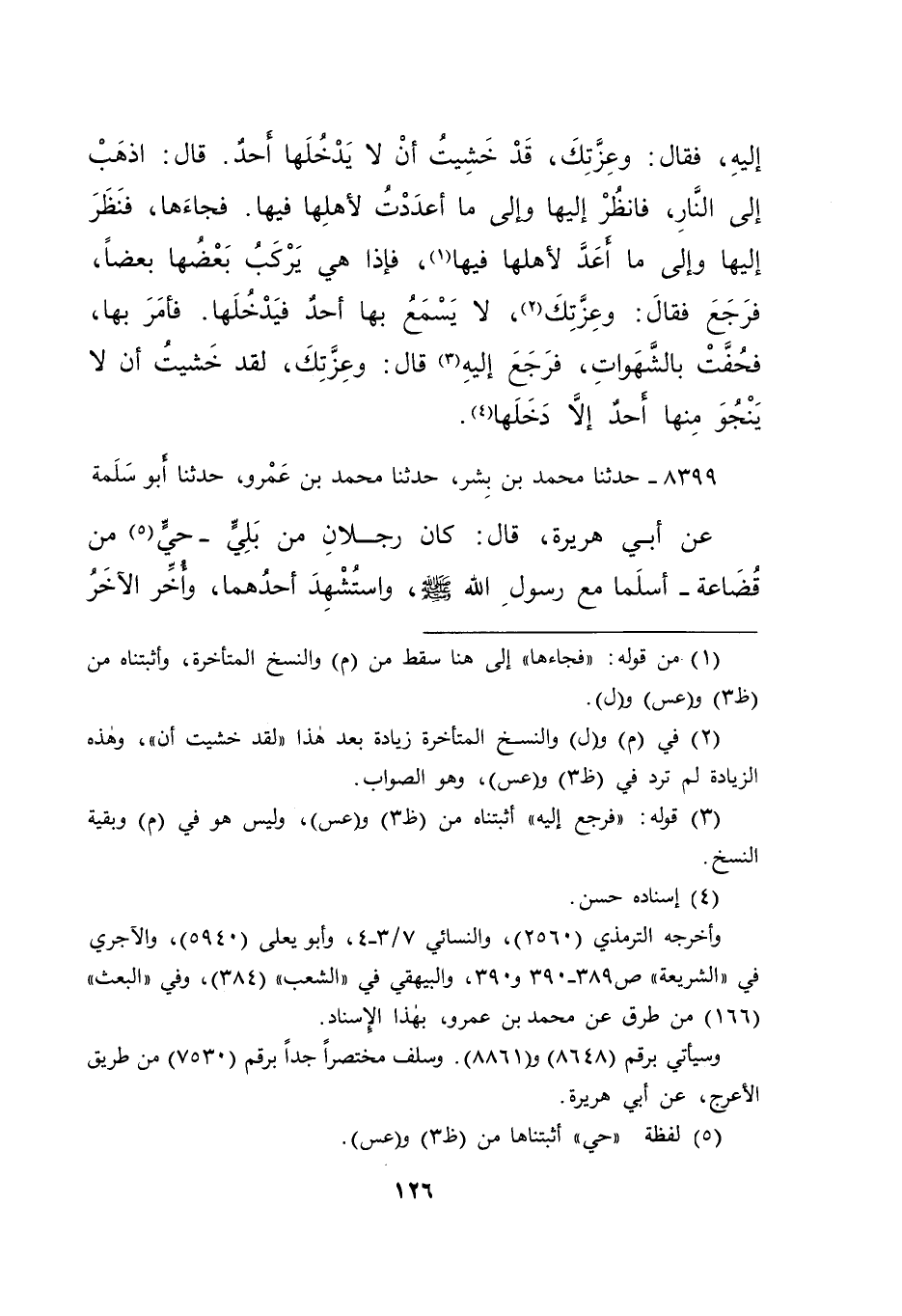 إِلَيْهِ، فَقَالَ: وَعِزَّتِكَ، قَدْ خَشِيتُ أَنْ لَا يَدْخُلَهَا أَحَدٌ، قَالَ: اذْهَبْ إِلَى النَّارِ فَانْظُرْ إِلَيْهَا وَإِلَى مَا أَعْدَدْتُ لِأَهْلِهَا فِيهَا (١) ، فَجَاءَهَا فَنَظَرَ إِلَيْهَا وَإِلَى مَا أُعِدَّ لِأَهْلِهَا فِيهَا، فَإِذَا هِيَ يَرْكَبُ بَعْضُهَا بَعْضًا، فَرَجَعَ، فقَالَ: وَعِزَّتِكَ (٢) ، لَا يَسْمَعَ بِهَا أَحَدٌ فَيَدْخُلَهَا، فَأَمَرَ بِهَا فَحُفَّتْ بِالشَّهَوَاتِ، فَرَجَعَ إِلَيْهِ (٣) ، قَالَ: وَعِزَّتِكَ، لَقَدْ خَشِيتُ أَنْ لَا يَنْجُوَ مِنْهَا أَحَدٌ إِلَّا دَخَلَهَا " (٤)