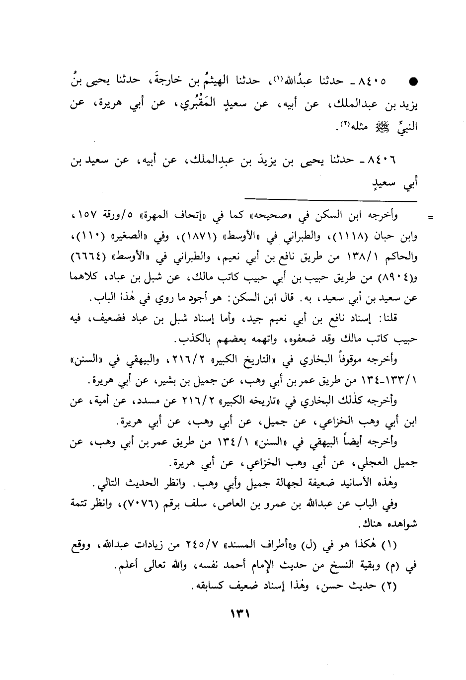 • ٨٤٠٥ - حَدَّثَنَا عَبْدُ اللهِ (١) ، حَدَّثَنَا الْهَيْثَمُ بْنُ خَارِجَةَ، حَدَّثَنَا يَحْيَى بْنُ يَزِيدَ بْنِ عَبْدِ الْمَلِكِ، عَنْ أَبِيهِ، عَنْ سَعِيدٍ الْمَقْبُرِيِّ، عَنْ أَبِي هُرَيْرَةَ، عَنِ النَّبِيِّ صَلَّى اللهُ عَلَيْهِ وَسَلَّمَ مِثْلَهُ (٢)