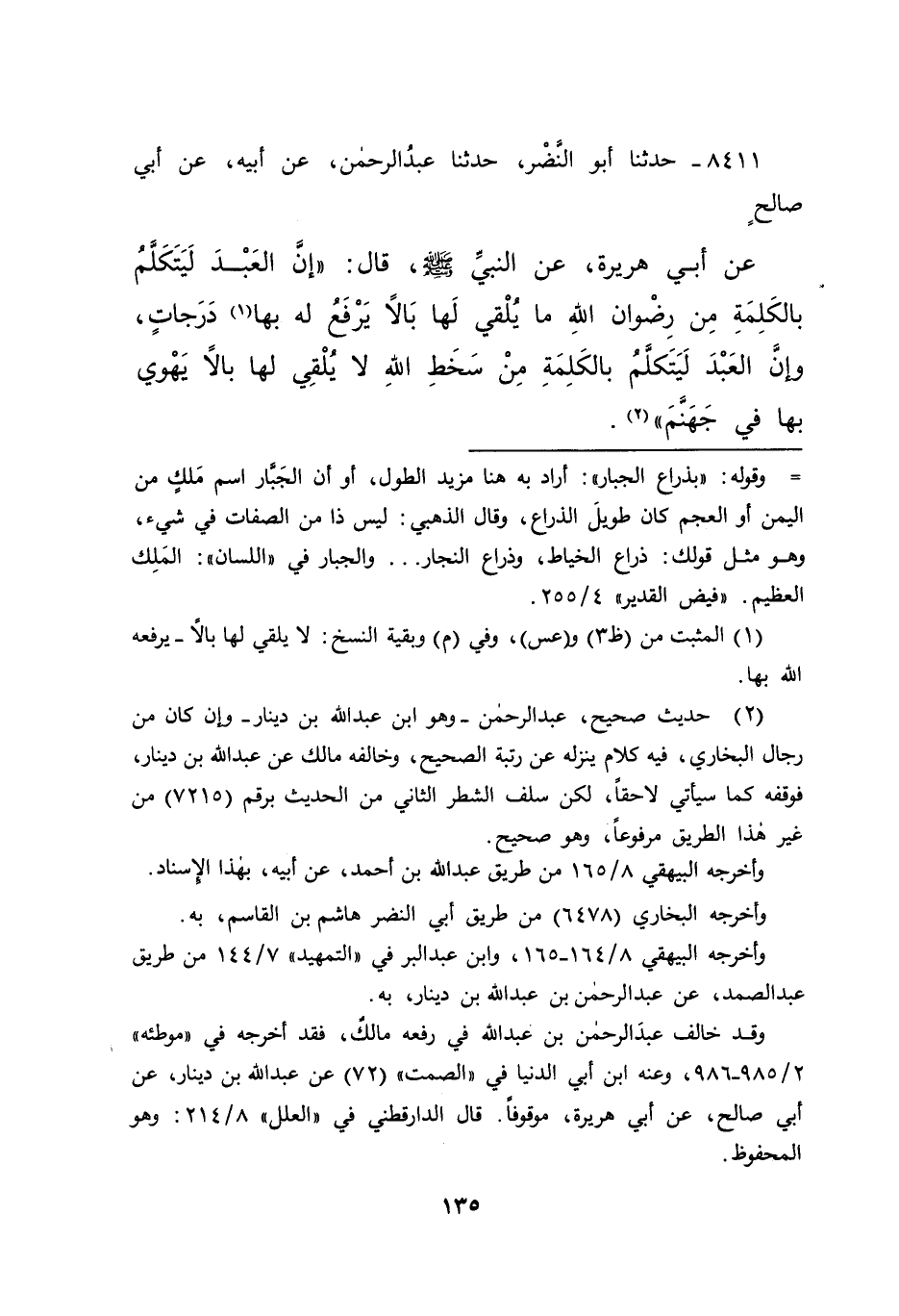 ٨٤١١ - حَدَّثَنَا أَبُو النَّضْرِ، حَدَّثَنَا عَبْدُ الرَّحْمَنِ، عَنْ أَبِيهِ، عَنْ أَبِي صَالِحٍ، عَنْ أَبِي هُرَيْرَةَ، عَنِ النَّبِيِّ صَلَّى اللهُ عَلَيْهِ وَسَلَّمَ قَالَ: " إِنَّ الْعَبْدَ لَيَتَكَلَّمُ بِالْكَلِمَةِ مِنْ رُضْوَانِ اللهِ، مَا يُلْقِي لَهَا بَالًا، يُرْفَعُ لَهُ بِهَا (١) دَرَجَاتٍ، وَإِنَّ الْعَبْدَ لَيَتَكَلَّمُ بِالْكَلِمَةِ مِنْ سَخَطِ اللهِ، لَا يُلْقِي لَهَا بَالًا، يَهْوِي بِهَا فِي جَهَنَّمَ " (٢)