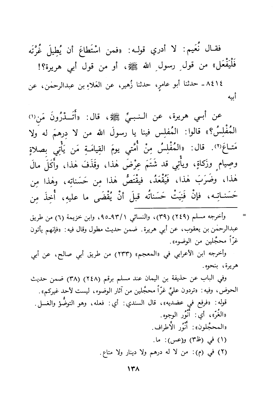 ٨٤١٤ - حَدَّثَنَا أَبُو عَامِرٍ، حَدَّثَنَا زُهَيْرٌ، عَنِ الْعَلَاءِ بْنِ عَبْدِ الرَّحْمَنِ، عَنْ أَبِيهِ، عَنْ أَبِي هُرَيْرَةَ، عَنِ النَّبِيِّ صَلَّى اللهُ عَلَيْهِ وَسَلَّمَ قَالَ: " أتَدْرُونَ مَنِ (١) الْمُفْلِسُ؟ " قَالُوا: الْمُفْلِسُ فِينَا يَا رَسُولَ اللهِ، مَنْ لَا دِرْهَمَ لَهُ، وَلَا مَتَاعَ (٢) ، قَالَ: " الْمُفْلِسُ مِنْ أُمَّتِي يَوْمَ الْقِيَامَةِ مَنْ يَأْتِي بِصَلَاةٍ، وَصِيَامٍ وَزَكَاةٍ، وَيَأْتِي قَدْ شَتَمَ عِرْضَ هَذَا، وَقَذَفَ هَذَا، وَأَكَلَ مَالَ هَذَا، وَضَرَبَ هَذَا، فَيُقْعَدُ فَيَقْتَصُّ هَذَا مِنْ حَسَنَاتِهِ، وَهَذَا مِنْ حَسَنَاتِهِ، فَإِنْ فَنِيَتْ حَسَنَاتُهُ، قَبْلَ أَنْ يُقْضَى مَا عَلَيْهِ، أُخِذَ مِنْ