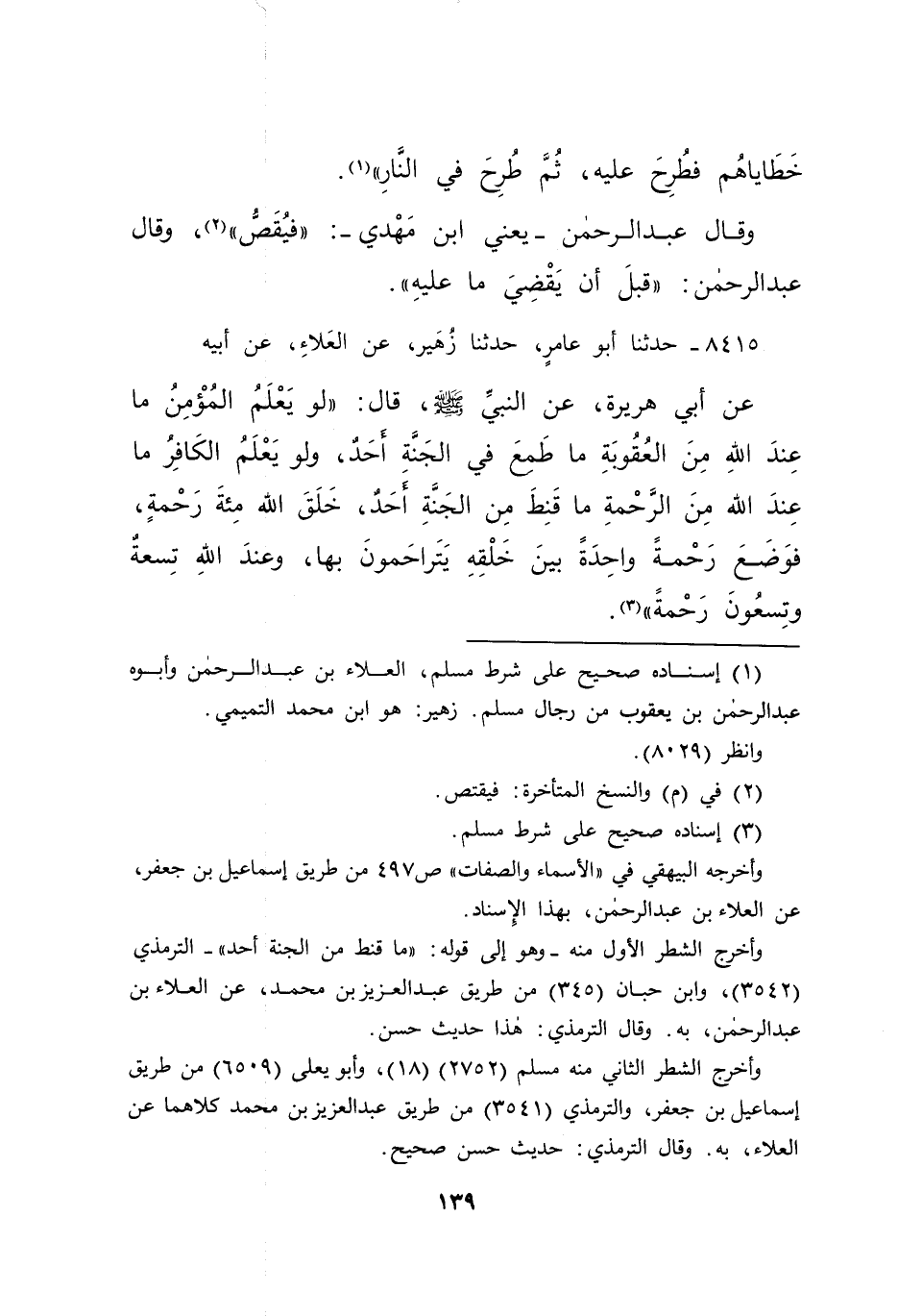 ٨٤١٥ - حَدَّثَنَا أَبُو عَامِرٍ، حَدَّثَنَا زُهَيْرٌ، عَنِ الْعَلَاءِ، عَنْ أَبِيهِ، عَنْ أَبِي هُرَيْرَةَ، عَنِ النَّبِيِّ صَلَّى اللهُ عَلَيْهِ وَسَلَّمَ قَالَ: " لَوْ يَعْلَمُ الْمُؤْمِنُ مَا عِنْدَ اللهِ مِنَ الْعُقُوبَةِ، مَا طَمِعَ فِي الْجَنَّةِ أَحَدٌ، وَلَوْ يَعْلَمُ الْكَافِرُ مَا عِنْدَ اللهِ مِنَ الرَّحْمَةِ، مَا قَنَطَ مِنَ الْجَنَّةِ أَحَدٌ، خَلَقَ اللهُ مِائَةَ رَحْمَةٍ، فَوَضَعَ رَحْمَةً وَاحِدَةً بَيْنَ خَلْقِهِ يَتَرَاحَمُونَ بِهَا، وَعِنْدَ اللهِ تِسْعَةٌ وَتِسْعُونَ رَحْمَةً " (٣)