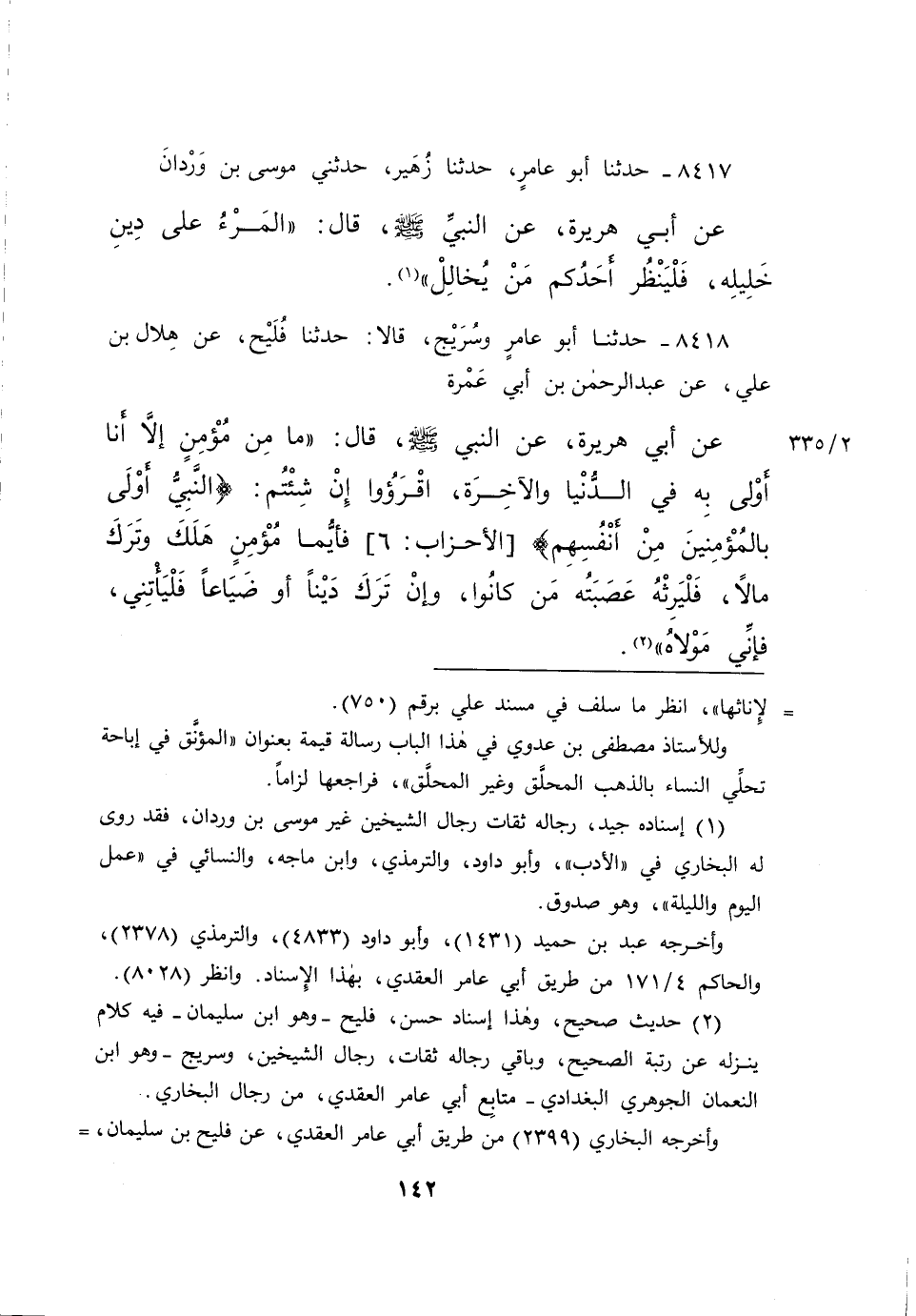 ٨٤١٧ - حَدَّثَنَا أَبُو عَامِرٍ، حَدَّثَنَا زُهَيْرٌ، حَدَّثَنِي مُوسَى بْنُ وَرْدَانَ، عَنْ أَبِي هُرَيْرَةَ، عَنِ النَّبِيِّ صَلَّى اللهُ عَلَيْهِ وَسَلَّمَ قَالَ: " الْمَرْءُ عَلَى دِينِ خَلِيلِهِ، فَلْيَنْظُرْ أَحَدُكُمْ مَنْ يُخَالِلْ " (١)