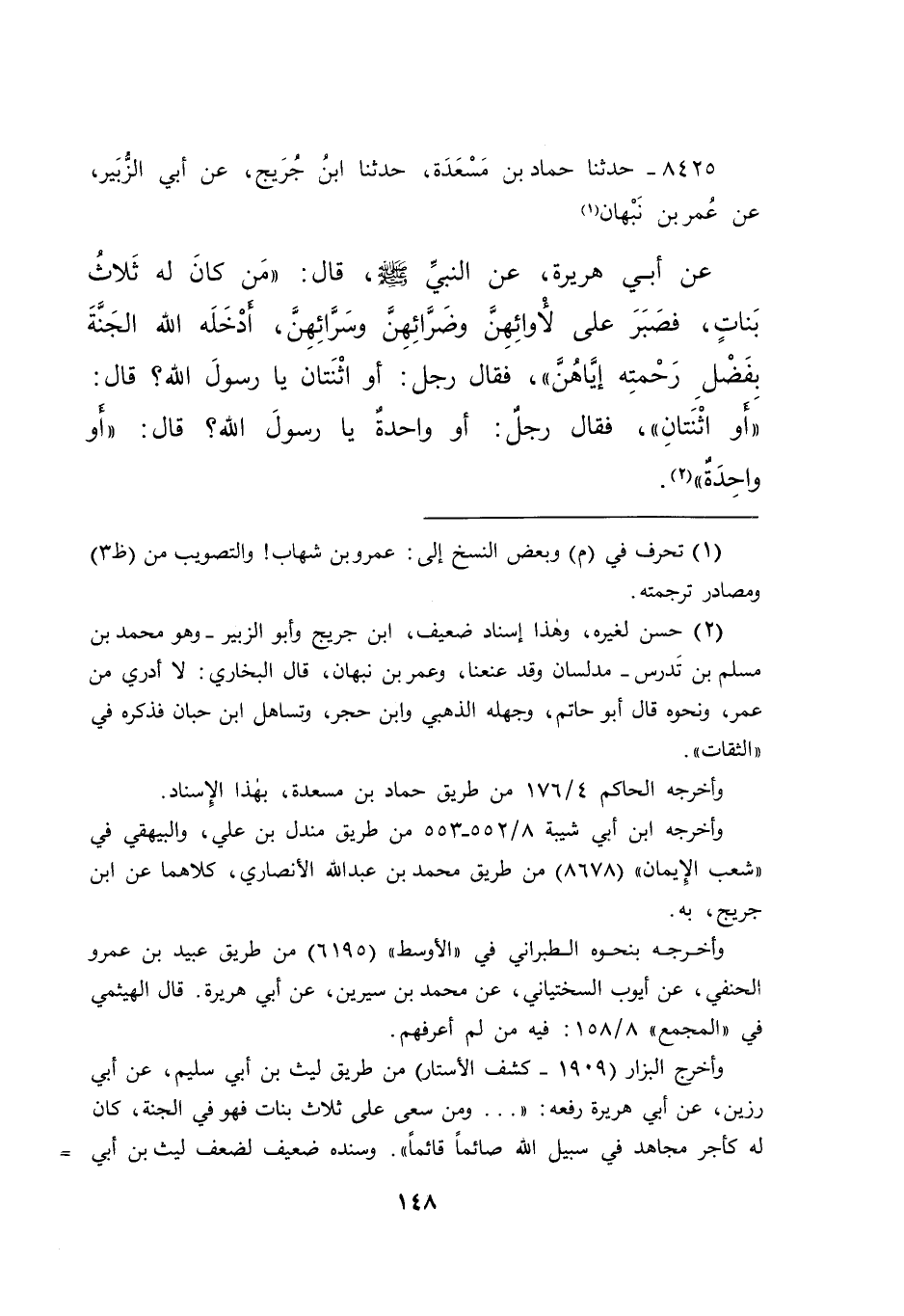 ٨٤٢٥ - حَدَّثَنَا حَمَّادُ بْنُ مَسْعَدَةَ، حَدَّثَنَا ابْنُ جُرَيْجٍ، عَنْ أَبِي الزُّبَيْرِ، عَنْ عَمْرِو بْنِ نَبْهَانَ (١) ، عَنْ أَبِي هُرَيْرَةَ، عَنِ النَّبِيِّ صَلَّى اللهُ عَلَيْهِ وَسَلَّمَ قَالَ: " مَنْ كَانَ لَهُ ثَلَاثُ بَنَاتٍ، فَصَبَرَ عَلَى لَأْوَائِهِنَّ، وَضَرَّائِهِنَّ، وَسَرَّائِهِنَّ، أَدْخَلَهُ اللهُ الْجَنَّةَ بِفَضْلِ رَحْمَتِهِ إِيَّاهُنَّ "، فَقَالَ رَجُلٌ: أَوْ ثِنْتَانِ يَا رَسُولَ اللهِ؟ قَالَ: " أَوِ اثِنْتَانِ "، فَقَالَ رَجُلٌ: أَوْ وَاحِدَةٌ يَا رَسُولَ اللهِ؟ قَالَ: " أَوْ وَاحِدَةٌ " (٢)