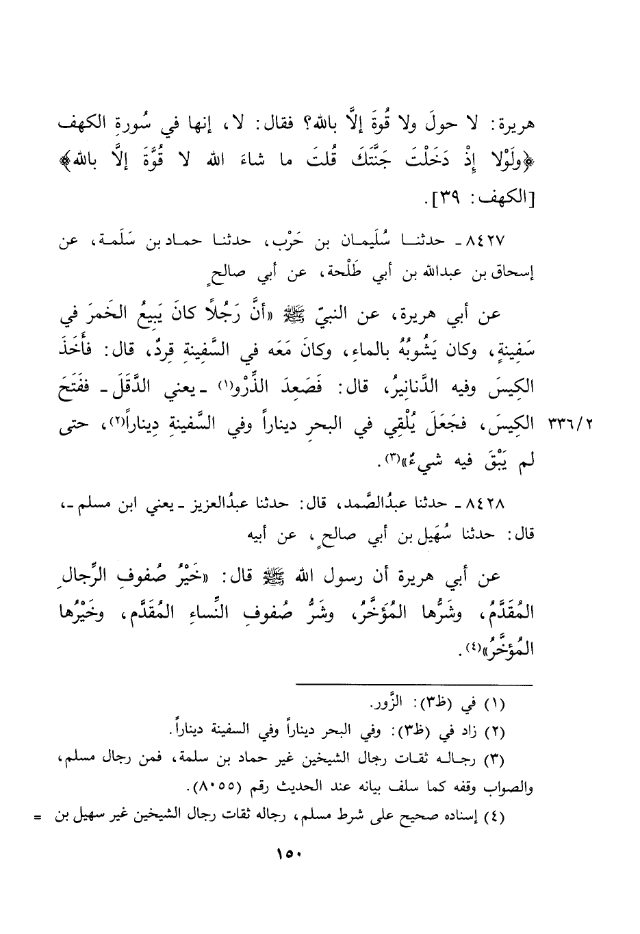 ٨٤٢٧ - حَدَّثَنَا سُلَيْمَانُ بْنُ حَرْبٍ، حَدَّثَنَا حَمَّادُ بْنُ سَلَمَةَ، عَنْ إِسْحَاقَ بْنِ عَبْدِ اللهِ بْنِ أَبِي طَلْحَةَ، عَنْ أَبِي صَالِحٍ، عَنْ أَبِي هُرَيْرَةَ، عَنِ النَّبِيِّ صَلَّى اللهُ عَلَيْهِ وَسَلَّمَ: " أَنَّ رَجُلًا كَانَ يَبِيعُ الْخَمْرَ فِي سَفِينَةٍ، وَكَانَ يَشُوبُهُ بِالْمَاءِ، وَكَانَ مَعَهُ فِي السَّفِينَةِ قِرْدٌ "، قَالَ: " فَأَخَذَ الْكِيسَ، وَفِيهِ الدَّنَانِيرُ "، قَالَ: " فَصَعِدَ الذَّرْوَ (١) ، يَعْنِي الدَّقَلَ، فَفَتَحَ الْكِيسَ، فَجَعَلَ يُلْقِي فِي الْبَحْرِ دِينَارًا، وَفِي السَّفِينَةِ دِينَارًا (٢) حَتَّى لَمْ يَبْقَ فِيهِ شَيْءٌ " (٣)