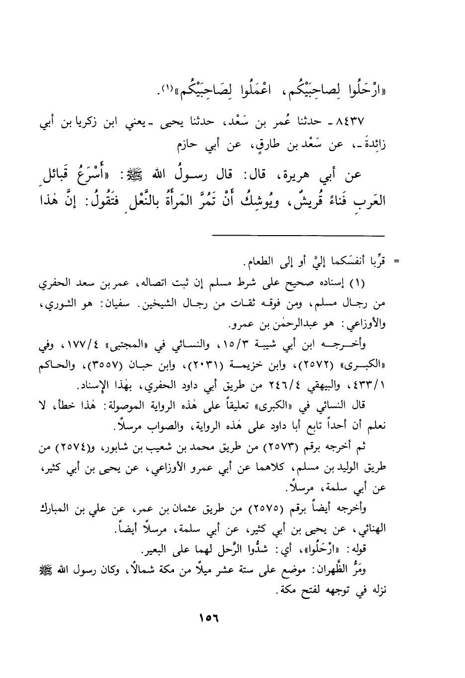 ٨٤٣٧ - حَدَّثَنَا عُمَرُ بْنُ سَعْدٍ، حَدَّثَنَا يَحْيَى يَعْنِي ابْنَ زَكَرِيَّا بْنِ أَبِي زَائِدَةَ، عَنْ سَعْدِ بْنِ طَارِقٍ، عَنْ أَبِي حَازِمٍ، عَنْ أَبِي هُرَيْرَةَ، قَالَ: قَالَ رَسُولُ اللهِ صَلَّى اللهُ عَلَيْهِ وَسَلَّمَ: " أَسْرَعُ قَبَائِلِ الْعَرَبِ فَنَاءً قُرَيْشٌ، وَيُوشِكُ أَنْ تَمُرَّ الْمَرْأَةُ بِالنَّعْلِ، فَتَقُولَ: إِنَّ هَذَا