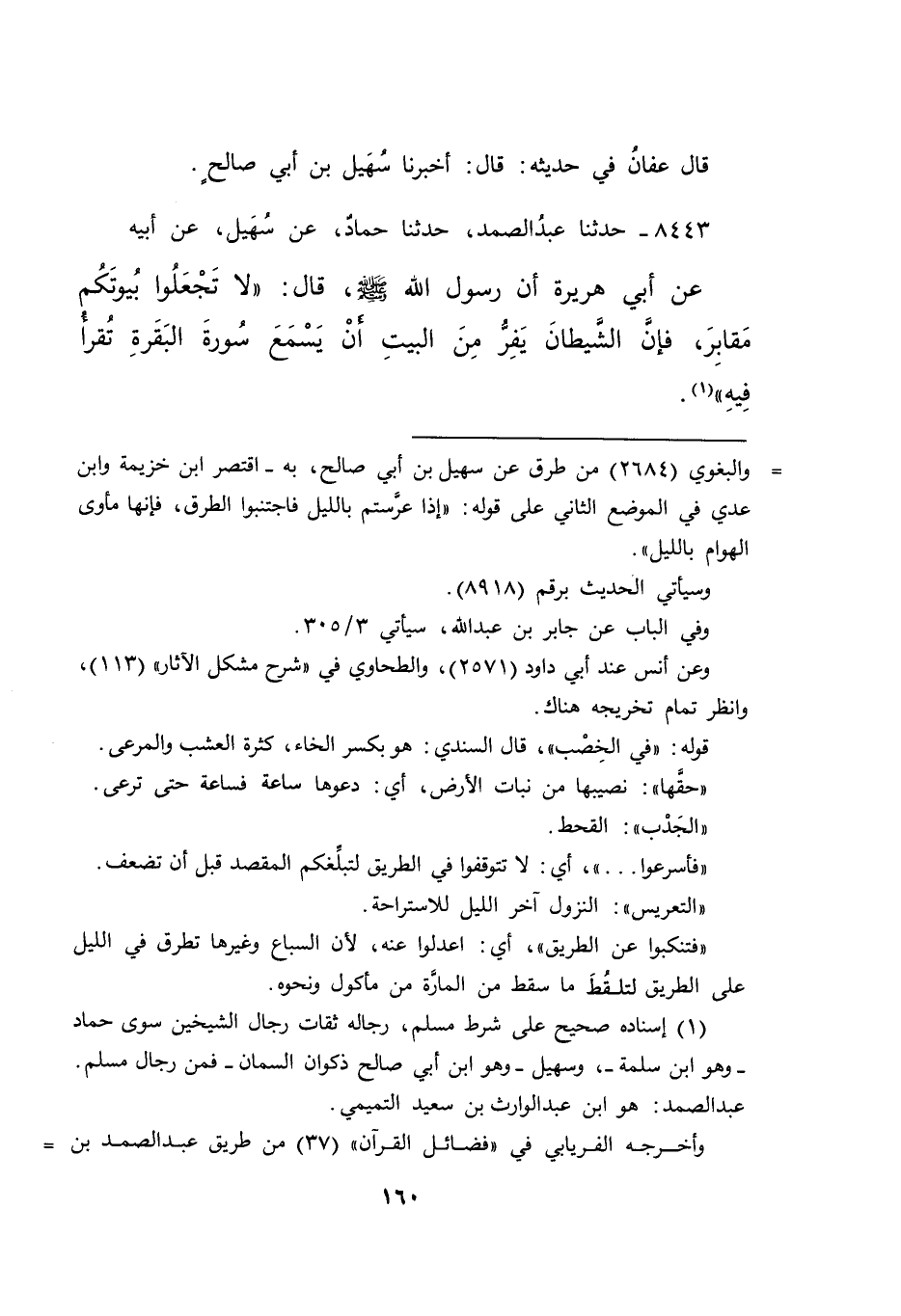٨٤٤٣ - حَدَّثَنَا عَبْدُ الصَّمَدِ، حَدَّثَنَا حَمَّادٌ، عَنْ سُهَيْلٍ، عَنْ أَبِيهِ، عَنْ أَبِي هُرَيْرَةَ، أَنَّ رَسُولَ اللهِ صَلَّى اللهُ عَلَيْهِ وَسَلَّمَ قَالَ: " لَا تَجْعَلُوا بُيُوتَكُمْ مَقَابِرَ، فَإِنَّ الشَّيْطَانَ يَفِرُّ مِنَ الْبَيْتِ، إِنْ يَسْمَعْ سُورَةَ الْبَقَرَةِ تُقْرَأُ فِيهِ " (١)