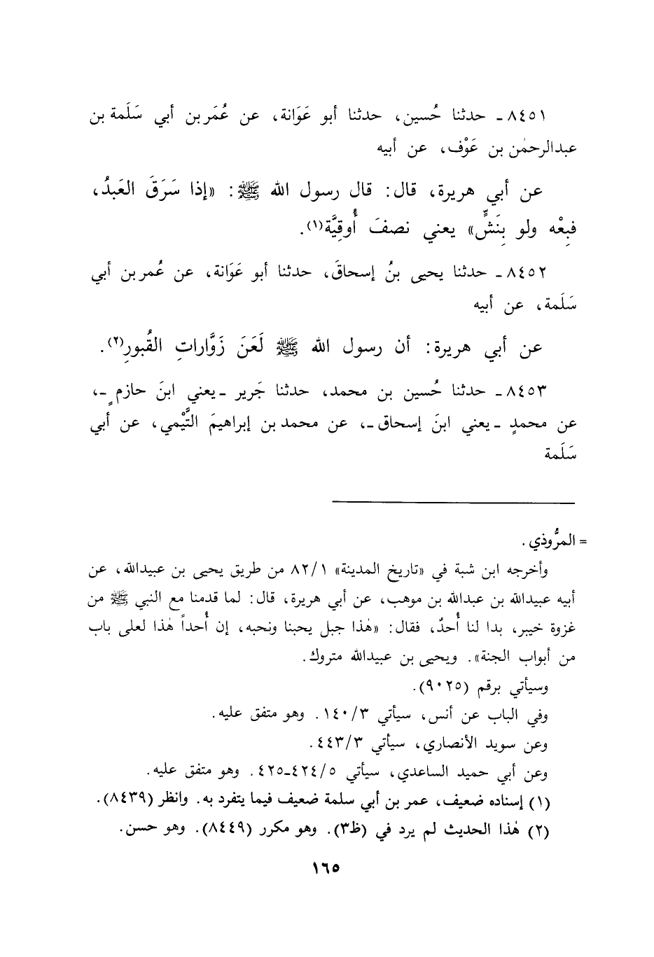 ٨٤٥٢ - حَدَّثَنَا يَحْيَى بْنُ إِسْحَاقَ، حَدَّثَنَا أَبُو عَوَانَةَ، عَنْ عُمَرَ بْنِ أَبِي سَلَمَةَ، عَنْ أَبِيهِ، عَنْ أَبِي هُرَيْرَةَ، أَنَّ رَسُولَ اللهِ صَلَّى اللهُ عَلَيْهِ وَسَلَّمَ: " لَعَنَ زَوَّارَاتِ الْقُبُورِ " (٢)