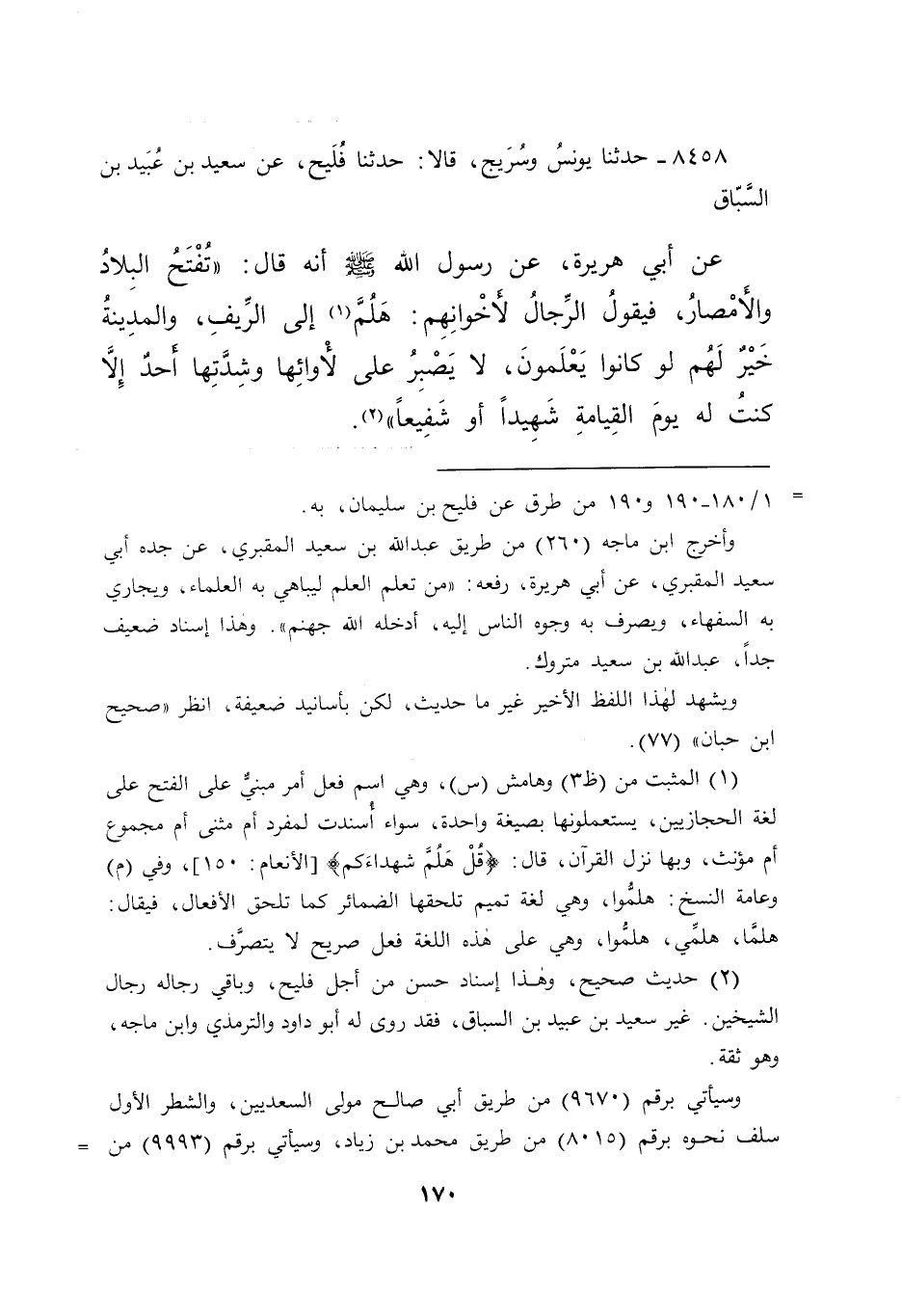٨٤٥٨ - حَدَّثَنَا يُونُسُ، وَسُرَيْجٌ، قَالَا: حَدَّثَنَا فُلَيْحٌ، عَنْ سَعِيدِ بْنِ عُبَيْدِ بْنِ السَّبَّاقِ، عَنْ أَبِي هُرَيْرَةَ، عَنْ رَسُولِ اللهِ صَلَّى اللهُ عَلَيْهِ وَسَلَّمَ أَنَّهُ قَالَ: " تُفْتَحُ الْبِلَادُ وَالْأَمْصَارُ، فَيَقُولُ الرِّجَالُ لِإِخْوَانِهِمْ: هَلُمَّ (١) إِلَى الرِّيفِ، وَالْمَدِينَةُ خَيْرٌ لَهُمْ لَوْ كَانُوا يَعْلَمُونَ، لَا يَصْبِرُ عَلَى لَأْوَائِهَا وَشِدَّتِهَا أَحَدٌ، إِلَّا كُنْتُ لَهُ يَوْمَ الْقِيَامَةِ شَهِيدًا أَوْ شَفِيعًا " (٢)