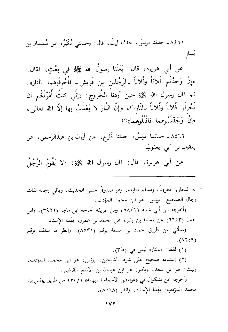 ٨٤٦١ - حَدَّثَنَا يُونُسُ، حَدَّثَنَا لَيْثٌ، قَالَ: وَحَدَّثَنِي بُكَيْرٌ، عَنْ سُلَيْمَانَ بْنِ يَسَارٍ، عَنْ أَبِي هُرَيْرَةَ قَالَ: بَعَثَنَا رَسُولُ اللهِ صَلَّى اللهُ عَلَيْهِ وَسَلَّمَ فِي بَعْثٍ، فَقَالَ: " إِنْ وَجَدْتُمْ فُلَانًا وَفُلَانًا لِرَجُلَيْنِ مِنْ قُرَيْشٍ فَأَحْرِقُوهُمَا بالنَّارِ "، ثُمَّ قَالَ رَسُولُ اللهِ صَلَّى اللهُ عَلَيْهِ وَسَلَّمَ حِينَ أَرَدْنَا الْخُرُوجَ: " إِنِّي كُنْتُ أَمَرْتُكُمْ أَنْ تُحْرِقُوا فُلَانًا وَفُلَانًا بِالنَّارِ (١) ، وَإِنَّ النَّارَ لَا يُعَذِّبُ بِهَا إِلَّا اللهُ تَعَالَى، فَإِنْ وَجَدْتُمُوهُمَا فَاقْتُلُوهُمَا " (٢)
