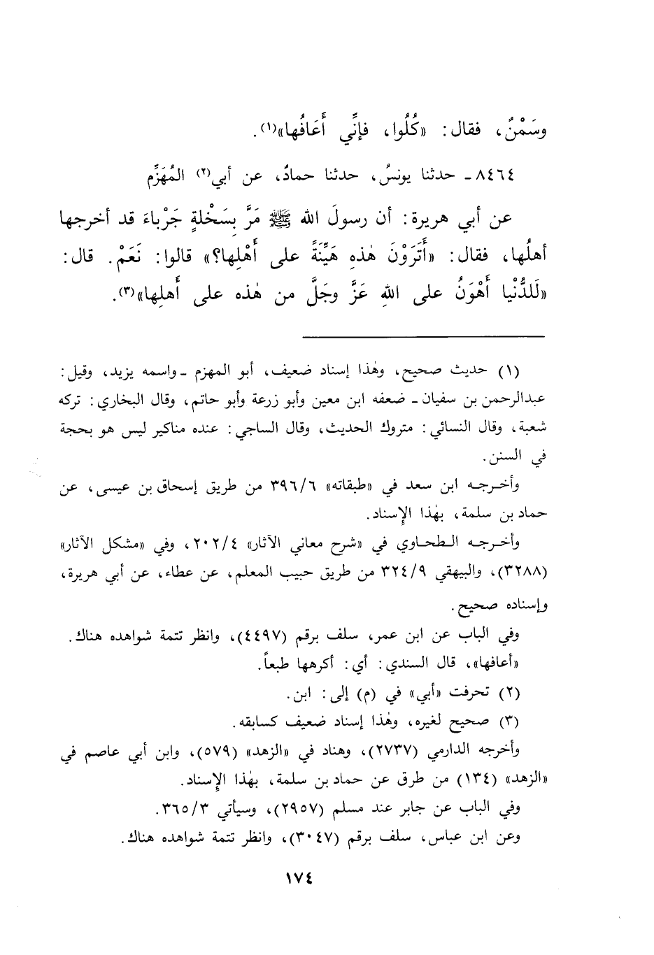 ٨٤٦٤ - حَدَّثَنَا يُونُسُ، حَدَّثَنَا حَمَّادٌ، عَنْ أَبِي (٢) الْمُهَزِّمِ، عَنْ أَبِي هُرَيْرَةَ، أَنَّ رَسُولَ اللهِ صَلَّى اللهُ عَلَيْهِ وَسَلَّمَ مَرَّ بِسَخْلَةٍ جَرْبَاءَ، قَدْ أَخْرَجَهَا أَهْلُهَا، فَقَالَ: " أَتَرَوْنَ هَذِهِ هَيِّنَةً عَلَى أَهْلِهَا؟ " قَالُوا: نَعَمْ، قَالَ: " لَلدُّنْيَا أَهْوَنُ عَلَى اللهِ عَزَّ وَجَلَّ مِنْ هَذِهِ عَلَى أَهْلِهَا " (٣)