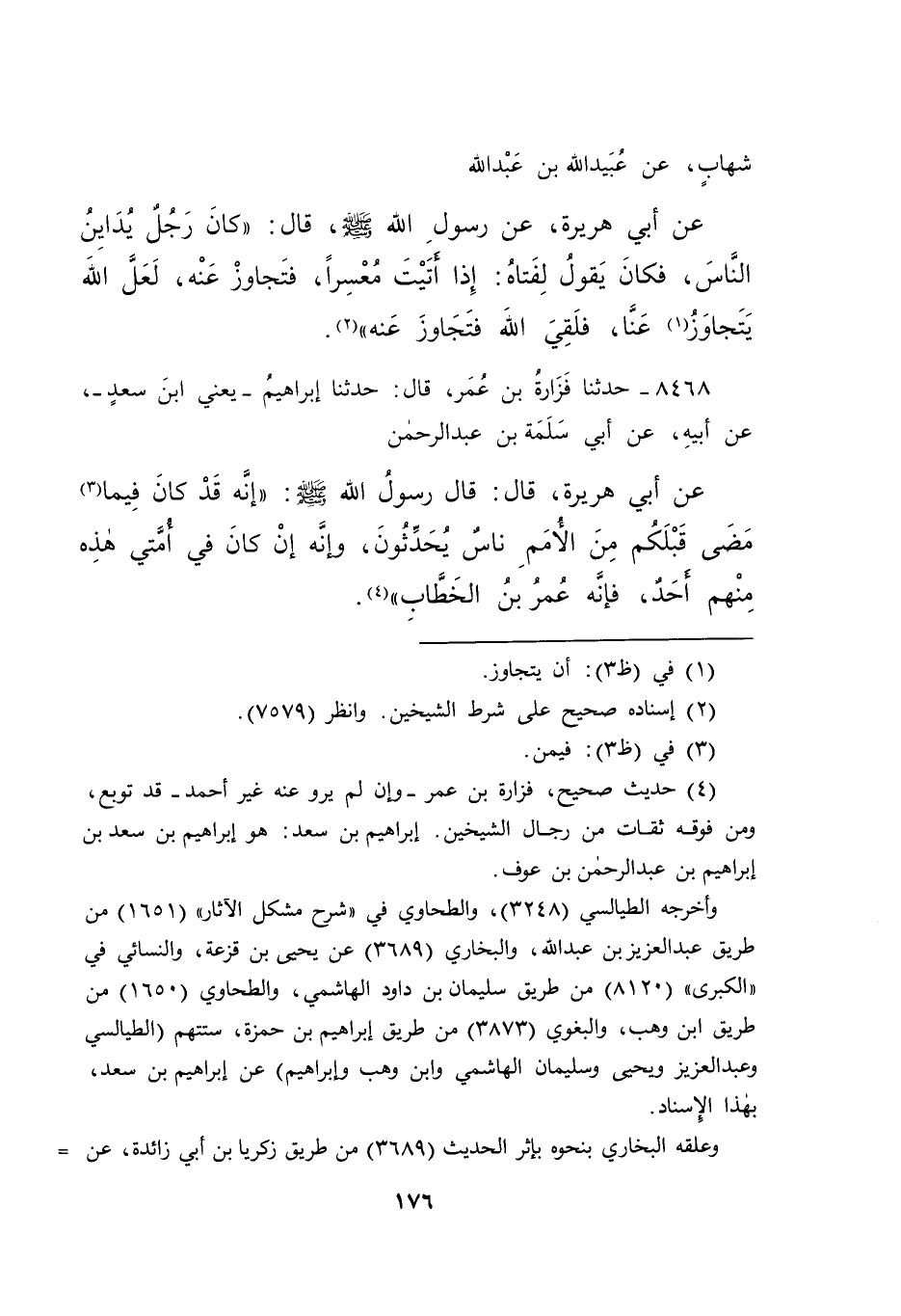٨٤٦٨ - حَدَّثَنَا فَزَارَةُ بْنُ عَمْرٍو، قَالَ: حَدَّثَنَا إِبْرَاهِيمُ يَعْنِي ابْنَ سَعْدٍ، عَنْ أَبِيهِ، عَنْ أَبِي سَلَمَةَ بْنِ عَبْدِ الرَّحْمَنِ، عَنْ أَبِي هُرَيْرَةَ، قَالَ: قَالَ رَسُولُ اللهِ صَلَّى اللهُ عَلَيْهِ وَسَلَّمَ: " إِنَّهُ قَدْ كَانَ فِيمَا (٣) مَضَى قَبْلَكُمْ مِنَ الْأُمَمِ نَاسٌ يُحَدَّثُونَ، وَإِنَّهُ إِنْ كَانَ فِي أُمَّتِي هَذِهِ مِنْهُمْ أَحَدٌ، فَإِنَّهُ عُمَرُ بْنُ الْخَطَّابِ "، (٤)
