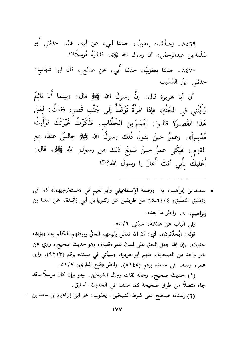 ٨٤٧٠ - حَدَّثَنَا يَعْقُوبُ، حَدَّثَنَا أَبِي، عَنْ صَالِحٍ، قَالَ ابْنُ شِهَابٍ: حَدَّثَنِي ابْنُ الْمُسَيِّبِ، أَنَّ أَبَا هُرَيْرَةَ، قَالَ: إِنَّ رَسُولَ اللهِ صَلَّى اللهُ عَلَيْهِ وَسَلَّمَ، قَالَ: " بَيْنَمَا أَنَا نَائِمٌ رَأَيْتُنِي فِي الْجَنَّةِ، فَإِذَا امْرَأَةٌ تَوَضَّأُ إِلَى جَنْبِ قَصْرٍ، فَقُلْتُ: لِمَنْ هَذَا الْقَصْرُ؟ قَالُوا: لِعُمَرَ بْنِ الْخَطَّابِ، فَذَكَرْتُ غَيْرَتَكَ فَوَلَّيْتُ مُدْبِرًا "، وَعُمَرُ حِينَ يَقُولُ ذَلِكَ رَسُولُ اللهِ صَلَّى اللهُ عَلَيْهِ وَسَلَّمَ، جَالِسٌ عِنْدَهُ مَعَ الْقَوْمِ، فَبَكَى عُمَرُ حِينَ سَمِعَ ذَلِكَ مِنْ رَسُولِ اللهِ صَلَّى اللهُ عَلَيْهِ وَسَلَّمَ، قَالَ: أَعَلَيْكَ بِأَبِي، أَنْتَ أَغَارُ يَا رَسُولَ اللهِ؟ (٢)