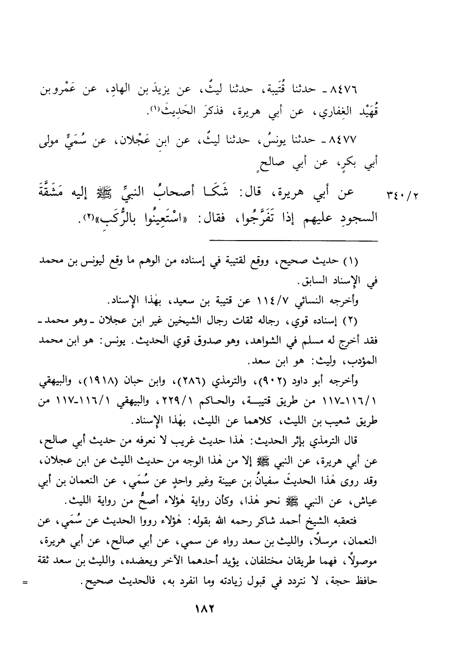 ٨٤٧٧ - حَدَّثَنَا يُونُسُ، حَدَّثَنَا لَيْثٌ، عَنِ ابْنِ عَجْلَانَ، عَنْ سُمَيٍّ مَوْلَى أَبِي بَكْرٍ، عَنْ أَبِي صَالِحٍ، عَنْ أَبِي هُرَيْرَةَ، قَالَ: " شَكَا أَصْحَابُ النَّبِيِّ صَلَّى اللهُ عَلَيْهِ وَسَلَّمَ إِلَيْهِ مَشَقَّةَ السُّجُودِ عَلَيْهِمْ، إِذَا تَفَرَّجُوا، فَقَالَ: " اسْتَعِينُوا بِالرُّكَبِ " (٢)