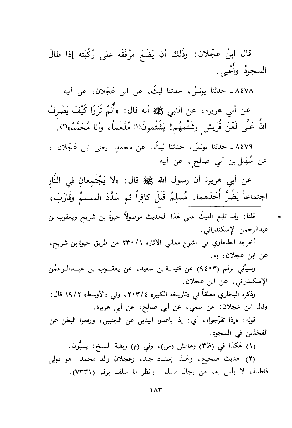 ٨٤٧٩ - حَدَّثَنَا يُونُسُ، حَدَّثَنَا لَيْثٌ، عَنْ مُحَمَّدٍ يَعْنِي ابْنَ عَجْلَانَ، عَنْ سُهَيْلِ بْنِ أَبِي صَالِحٍ، عَنْ أَبِيهِ، عَنْ أَبِي هُرَيْرَةَ، أَنَّ رَسُولَ اللهِ صَلَّى اللهُ عَلَيْهِ وَسَلَّمَ، قَالَ: " لَا يَجْتَمِعَانِ فِي النَّارِ اجْتِمَاعًا يَضُرُّ أَحَدَهُمَا: مُسْلِمٌ قَتَلَ كَافِرًا ثُمَّ سَدَّدَ الْمُسْلِمُ وَقَارَبَ،