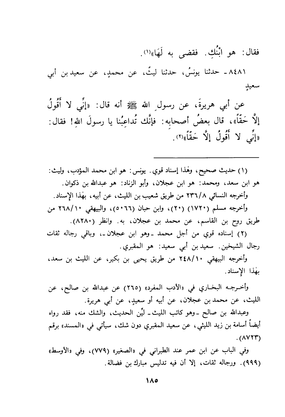 ٨٤٨١ - حَدَّثَنَا يُونُسُ، حَدَّثَنَا لَيْثٌ، عَنْ مُحَمَّدٍ، عَنْ سَعِيدِ بْنِ أَبِي سَعِيدٍ، عَنْ أَبِي هُرَيْرَةَ، عَنْ رَسُولِ اللهِ صَلَّى اللهُ عَلَيْهِ وَسَلَّمَ أَنَّهُ قَالَ: " إِنِّي لَا أَقُولُ إِلَّا حَقًّا "، قَالَ بَعْضُ أَصْحَابِهِ: فَإِنَّكَ تُدَاعِبُنَا يَا رَسُولَ اللهِ، فَقَالَ: " إِنِّي لَا أَقُولُ إِلَّا حَقًّا " (٢)
