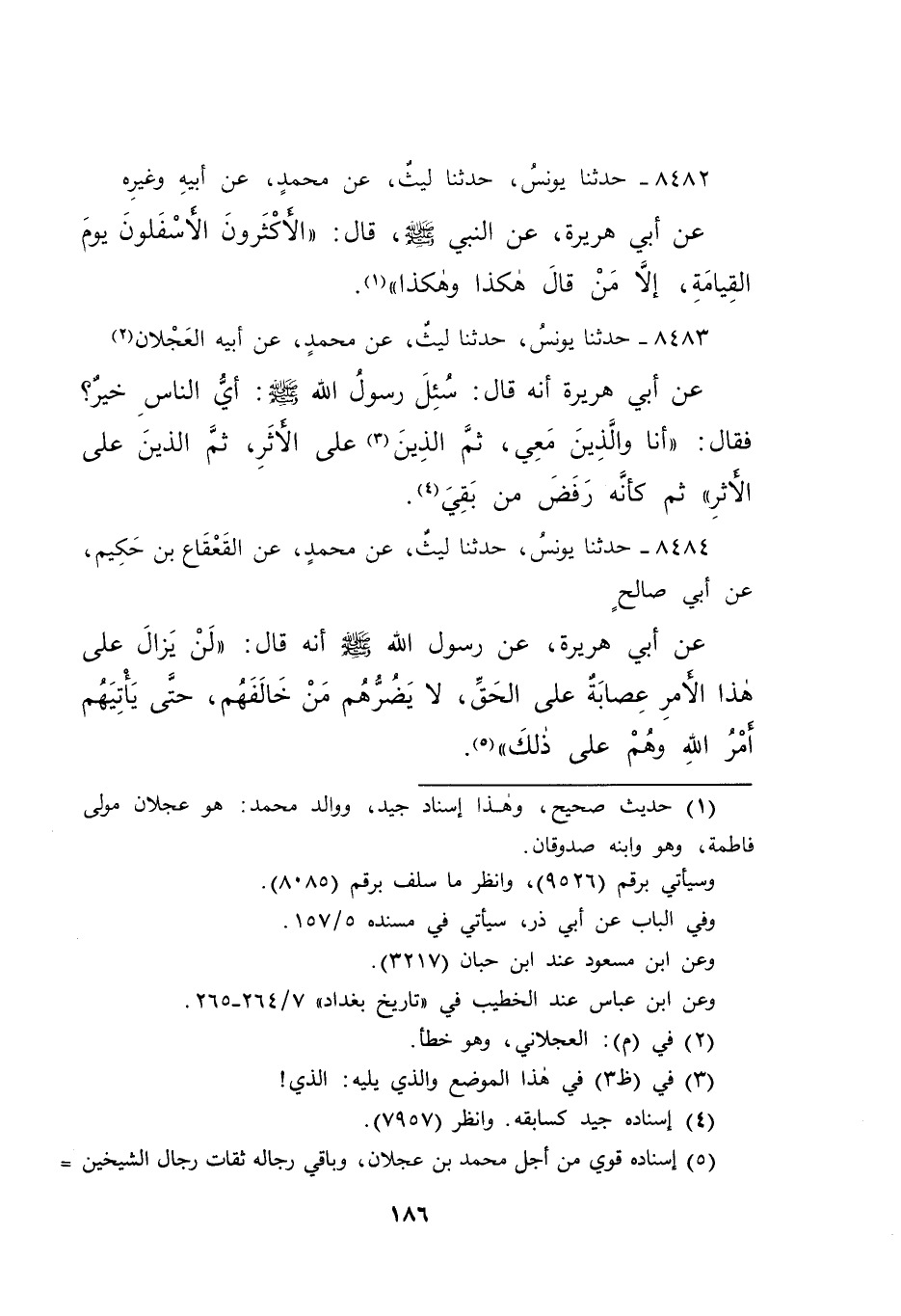 ٨٤٨٤ - حَدَّثَنَا يُونُسُ، حَدَّثَنَا لَيْثٌ، عَنْ مُحَمَّدٍ، عَنِ الْقَعْقَاعِ بْنِ حَكِيمٍ، عَنْ أَبِي صَالِحٍ، عَنْ أَبِي هُرَيْرَةَ، عَنْ رَسُولِ اللهِ صَلَّى اللهُ عَلَيْهِ وَسَلَّمَ، أَنَّهُ قَالَ: " لَنْ يَزَالَ عَلَى هَذَا الْأَمْرِ عِصَابَةٌ عَلَى الْحَقِّ، لَا يَضُرُّهُمْ مَنْ خَالَفَهُمْ، حَتَّى يَأْتِيَهُمْ أَمْرُ اللهِ، وَهُمْ عَلَى ذَلِكَ " (٥)