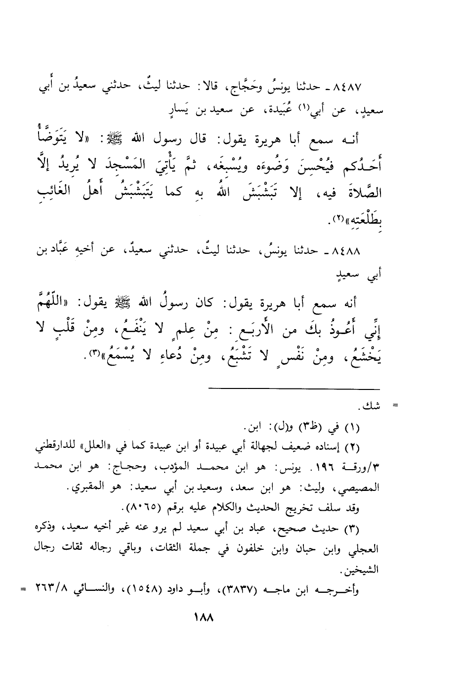 (٣) حديث صحيح، عباد بن أبي سعيد لم يرو عنه غير أخيه سعيد، وذكره العجلي وابن حبان وابن خلفون في جملة الثقات، وباقي رجاله ثقات رجال الشيخين.