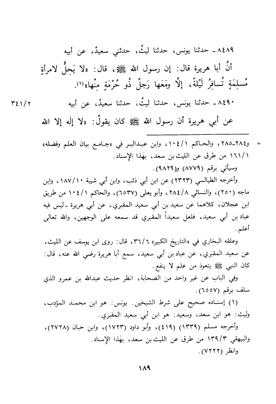 ٨٤٨٩ - حَدَّثَنَا يُونُسُ، حَدَّثَنَا لَيْثٌ، حَدَّثَنِي سَعِيدٌ، عَنْ أَبِيهِ، أَنَّ أَبَا هُرَيْرَةَ، قَالَ: إِنَّ رَسُولَ اللهِ صَلَّى اللهُ عَلَيْهِ وَسَلَّمَ، قَالَ: " لَا يَحِلُّ لِامْرَأَةٍ مُسْلِمَةٍ تُسَافِرُ لَيْلَةً، إِلَّا وَمَعَهَا رَجُلٌ ذُو حُرْمَةٍ مِنْهَا " (١)