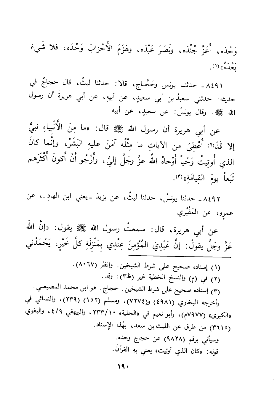 ٨٤٩١ - حَدَّثَنَا يُونُسُ، وَحَجَّاجٌ، قَالَا: حَدَّثَنَا لَيْثٌ، قَالَ حَجَّاجٌ فِي حَدِيثِهِ: حَدَّثَنِي سَعِيدُ بْنُ أَبِي سَعِيدٍ، عَنْ أَبِيهِ، عَنْ أَبِي هُرَيْرَةَ، أَنَّ رَسُولَ اللهِ صَلَّى اللهُ عَلَيْهِ وَسَلَّمَ، وَقَالَ يُونُسُ: عَنْ سَعِيدٍ، عَنْ أَبِيهِ، عَنْ أَبِي هُرَيْرَةَ، أَنَّ رَسُولَ اللهِ صَلَّى اللهُ عَلَيْهِ وَسَلَّمَ، قَالَ: " مَا مِنَ الْأَنْبِيَاءِ نَبِيٌّ إِلَّا قَدْ (٢) أُعْطِيَ مِنَ الْآيَاتِ مَا مِثْلُهُ آمَنَ عَلَيْهِ الْبَشَرُ، وَإِنَّمَا كَانَ الَّذِي أُوتِيتُ وَحْيًا أَوْحَاهُ اللهُ عَزَّ وَجَلَّ إِلَيَّ، وَأَرْجُو أَنْ أَكُونَ أَكْثَرَهُمْ تَبَعًا يَوْمَ الْقِيَامَةِ " (٣)