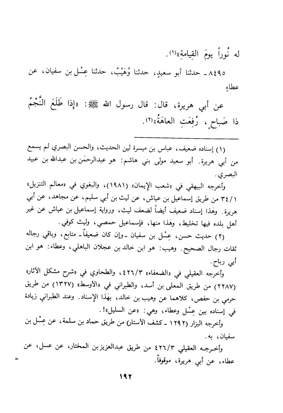 ٨٤٩٥ - حَدَّثَنَا أَبُو سَعِيدٍ، حَدَّثَنَا وُهَيْبٌ، حَدَّثَنَا عِسْلُ بْنُ سُفْيَانَ، عَنْ عَطَاءٍ، عَنْ أَبِي هُرَيْرَةَ، قَالَ: قَالَ رَسُولُ اللهِ صَلَّى اللهُ عَلَيْهِ وَسَلَّمَ: " إِذَا طَلَعَ النَّجْمُ ذَا صَبَاحٍ، رُفِعَتِ الْعَاهَةُ " (٢)