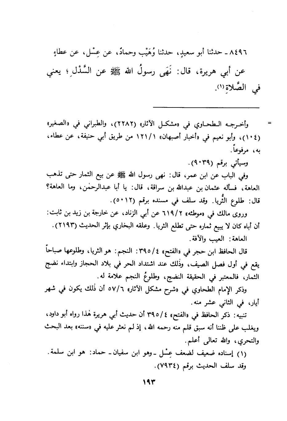 ٨٤٩٦ - حَدَّثَنَا أَبُو سَعِيدٍ، حَدَّثَنَا وُهَيْبٌ، وَحَمَّادٌ، عَنْ عِسْلٍ، عَنْ عَطَاءٍ، عَنْ أَبِي هُرَيْرَةَ، قَالَ: " نَهَى رَسُولُ اللهِ صَلَّى اللهُ عَلَيْهِ وَسَلَّمَ عَنِ السَّدْلِ " يَعْنِي فِي الصَّلَاةِ (١)