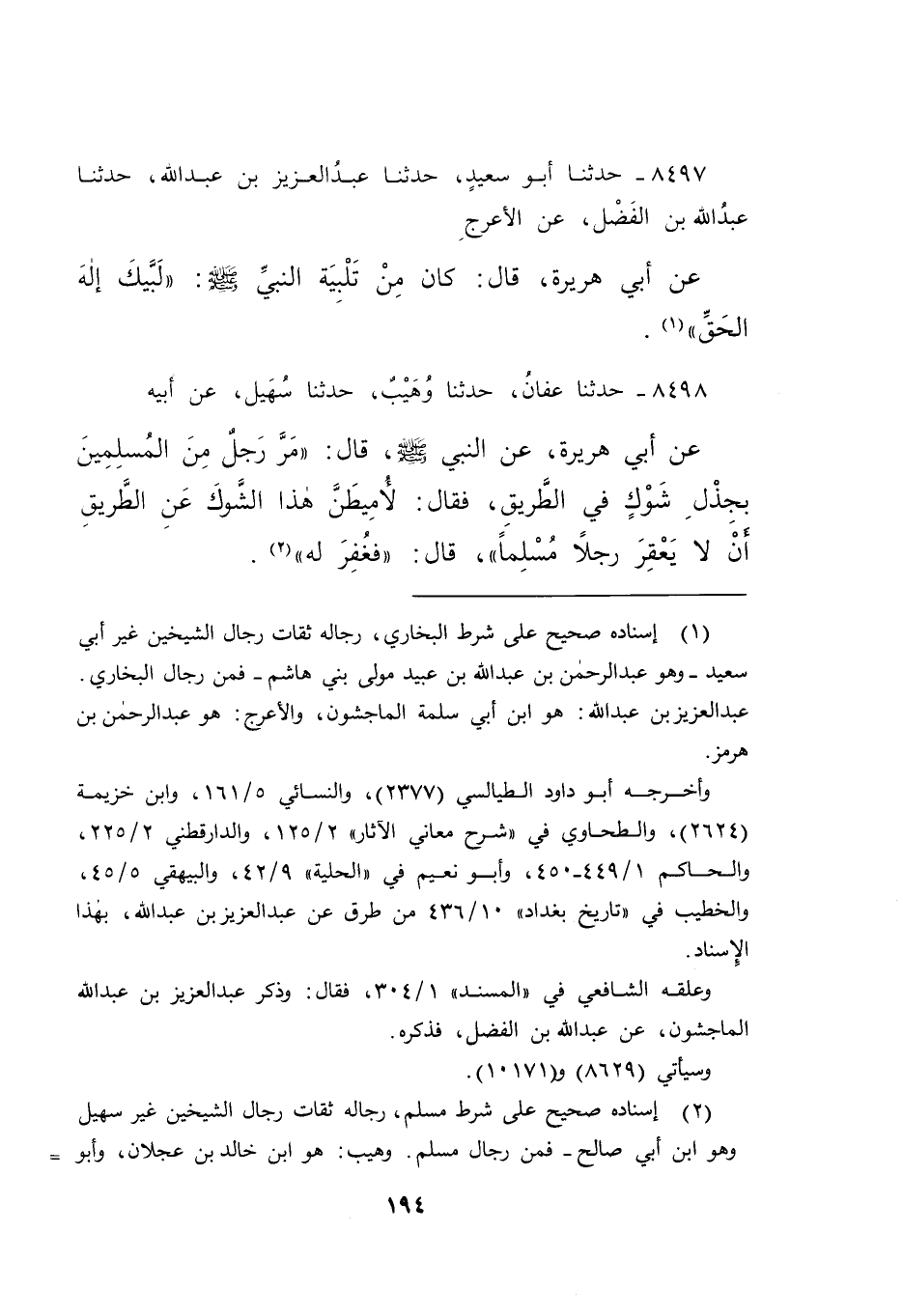 ٨٤٩٨ - حَدَّثَنَا عَفَّانُ، حَدَّثَنَا وُهَيْبٌ، حَدَّثَنَا سُهَيْلٌ، عَنْ أَبِيهِ، عَنْ أَبِي هُرَيْرَةَ، عَنِ النَّبِيِّ صَلَّى اللهُ عَلَيْهِ وَسَلَّمَ، قَالَ: " مَرَّ رَجُلٌ مِنَ الْمُسْلِمِينَ بِجِذْلِ شَوْكٍ فِي الطَّرِيقِ، فَقَالَ: لَأُمِيطَنَّ هَذَا الشَّوْكَ عَنِ الطَّرِيقِ أَنْ لَا يَعْقِرَ رَجُلًا مُسْلِمًا "، قَالَ: " فَغُفِرَ لَهُ " (٢)