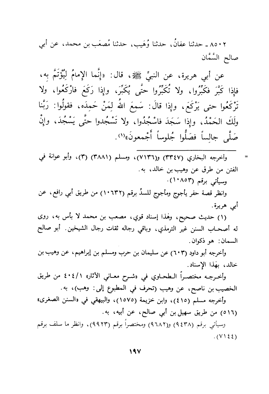 ٨٥٠٢ - حَدَّثَنَا عَفَّانُ، حَدَّثَنَا وُهَيْبٌ، حَدَّثَنَا مُصْعَبُ بْنُ مُحَمَّدٍ، عَنْ أَبِي صَالِحٍ السَّمَّانِ، عَنْ أَبِي هُرَيْرَةَ، عَنِ النَّبِيِّ صَلَّى اللهُ عَلَيْهِ وَسَلَّمَ، قَالَ: " إِنَّمَا الْإِمَامُ لِيُؤْتَمَّ بِهِ، فَإِذَا كَبَّرَ فَكَبِّرُوا، وَلَا تُكَبِّرُوا حَتَّى يُكَبِّرَ، وَإِذَا رَكَعَ فَارْكَعُوا، وَلَا تَرْكَعُوا حَتَّى يَرْكَعَ، وَإِذَا قَالَ: سَمِعَ اللهُ لِمَنْ حَمِدَهُ، فَقُولُوا: رَبَّنَا وَلَكَ الْحَمْدُ، وَإِذَا سَجَدَ فَاسْجُدُوا، وَلَا تَسْجُدُوا حَتَّى يَسْجُدَ، وَإِنْ صَلَّى جَالِسًا، فَصَلُّوا جُلُوسًا أَجْمَعُونَ " (١)