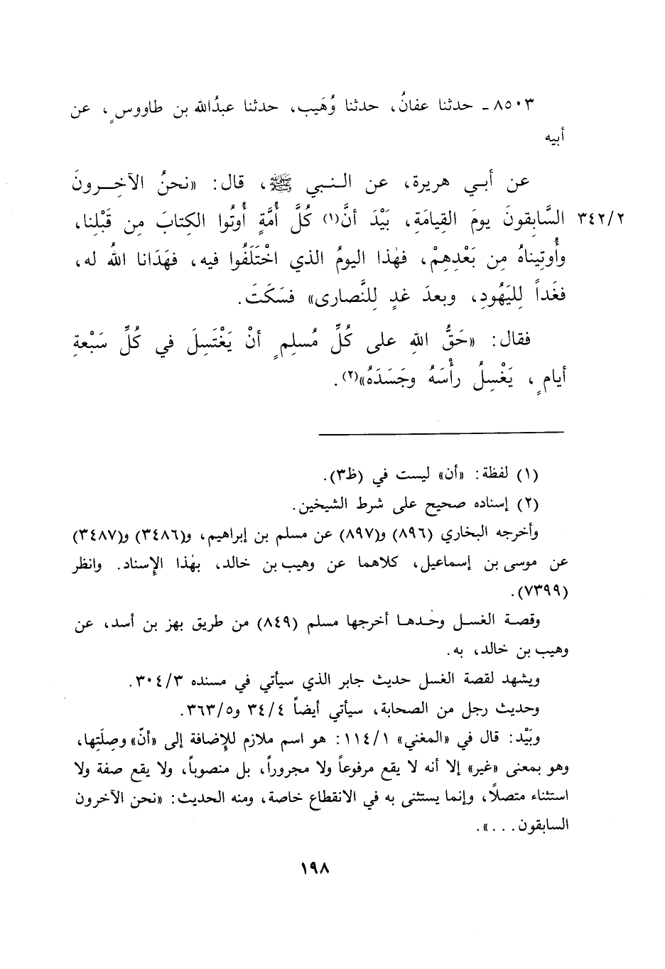 ٨٥٠٣ - حَدَّثَنَا عَفَّانُ، حَدَّثَنَا وُهَيْبٌ، حَدَّثَنَا عَبْدُ اللهِ بْنُ طَاوُسٍ، عَنْ أَبِيهِ، عَنْ أَبِي هُرَيْرَةَ، عَنِ النَّبِيِّ صَلَّى اللهُ عَلَيْهِ وَسَلَّمَ، قَالَ: " نَحْنُ الْآخِرُونَ السَّابِقُونَ يَوْمَ الْقِيَامَةِ، بَيْدَ أَنَّ (١) كُلَّ أُمَّةٍ أُوتُوا الْكِتَابَ مِنْ قَبْلِنَا، وَأُوتِينَاهُ مِنْ بَعْدِهِمْ، فَهَذَا الْيَوْمُ الَّذِي اخْتَلَفُوا فِيهِ، فَهَدَانَا اللهُ لَهُ، فَغَدًا لِلْيَهُودِ، وَبَعْدَ غَدٍ لِلنَّصَارَى "، فَسَكَتَ
