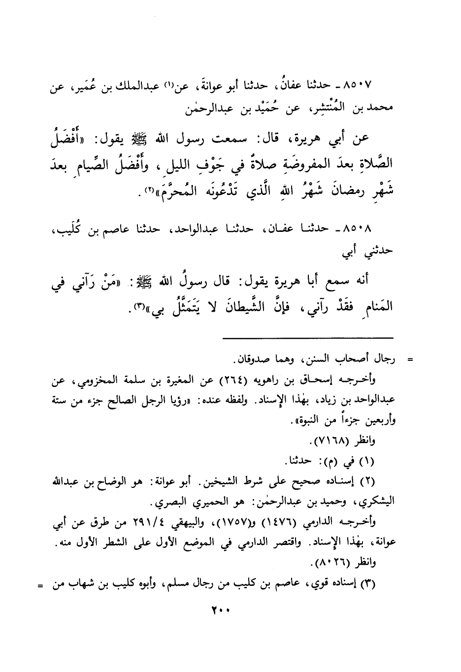٨٥٠٧ - حَدَّثَنَا عَفَّانُ، حَدَّثَنَا أَبُو عَوَانَةَ، عَنْ (١) عَبْدِ الْمَلِكِ بْنِ عُمَيْرٍ، عَنْ مُحَمَّدِ بْنِ الْمُنْتَشِرِ، عَنْ حُمَيْدِ بْنِ عَبْدِ الرَّحْمَنِ، عَنْ أَبِي هُرَيْرَةَ قَالَ: سَمِعْتُ رَسُولَ اللهِ صَلَّى اللهُ عَلَيْهِ وَسَلَّمَ يَقُولُ: " أَفْضَلُ الصَّلَاةِ بَعْدَ الْمَفْرُوضَةِ، صَلَاةٌ فِي جَوْفِ اللَّيْلِ، وَأَفْضَلُ الصِّيَامِ بَعْدَ شَهْرِ رَمَضَانَ، شَهْرُ اللهِ الَّذِي تَدْعُونَهُ الْمُحَرَّمَ " (٢)