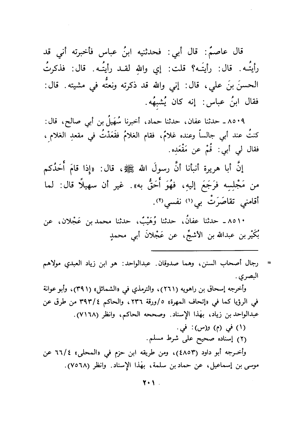 ٨٥٠٩ - حَدَّثَنَا عَفَّانُ، حَدَّثَنَا حَمَّادٌ، أَخْبَرَنَا سُهَيْلُ بْنُ أَبِي صَالِحٍ، قَالَ: كُنْتُ عِنْدَ أَبِي جَالِسًا، وَعِنْدَهُ غُلَامٌ، فَقَامَ الْغُلَامُ، فَقَعَدْتُ فِي مَقْعَدِ الْغُلَامِ، فَقَالَ لِي أَبِي: قُمْ عَنْ مَقْعَدِهِ، إِنَّ أَبَا هُرَيْرَةَ، أَنْبَأَنَا، أَنَّ رَسُولَ اللهِ صَلَّى اللهُ عَلَيْهِ وَسَلَّمَ، قَالَ: " إِذَا قَامَ أَحَدُكُمْ مِنْ مَجْلِسِهِ فَرَجَعَ إِلَيْهِ فَهُوَ أَحَقُّ بِهِ " غَيْرَ أَنَّ سُهَيْلًا، قَالَ: " لَمَّا أَقَامَنِي تَقَاصَرَتْ بِي (١) نَفْسِي " (٢)