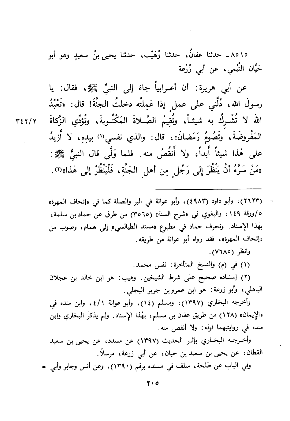 ٨٥١٥ - حَدَّثَنَا عَفَّانُ، حَدَّثَنَا وُهَيْبٌ، حَدَّثَنَا يَحْيَى بْنُ سَعِيدٍ وَهُوَ أَبُو حَيَّانَ التَّيْمِيُّ، عَنْ أَبِي زُرْعَةَ، عَنْ أَبِي هُرَيْرَةَ، أَنَّ أَعْرَابِيًّا جَاءَ إِلَى النَّبِيِّ صَلَّى اللهُ عَلَيْهِ وَسَلَّمَ، فَقَالَ: يَا رَسُولَ اللهِ، دُلَّنِي عَلَى عَمَلٍ إِذَا عَمِلْتُهُ دَخَلْتُ الْجَنَّةَ، قَالَ: " تَعْبُدُ اللهَ لَا تُشْرِكُ بِهِ شَيْئًا، وَتُقِيمُ الصَّلَاةَ الْمَكْتُوبَةَ، وَتُؤَدِّي الزَّكَاةَ الْمَفْرُوضَةَ، وَتَصُومُ رَمَضَانَ "، قَالَ: وَالَّذِي نَفْسِي (١) بِيَدِهِ، لَا أَزِيدُ عَلَى هَذَا شَيْئًا أَبَدًا، وَلَا أَنْقُصُ مِنْهُ، فَلَمَّا وَلَّى، قَالَ النَّبِيُّ صَلَّى اللهُ عَلَيْهِ وَسَلَّمَ: " مَنْ سَرَّهُ أَنْ يَنْظُرَ إِلَى رَجُلٍ مِنْ أَهْلِ الْجَنَّةِ، فَلْيَنْظُرْ إِلَى هَذَا " (٢)