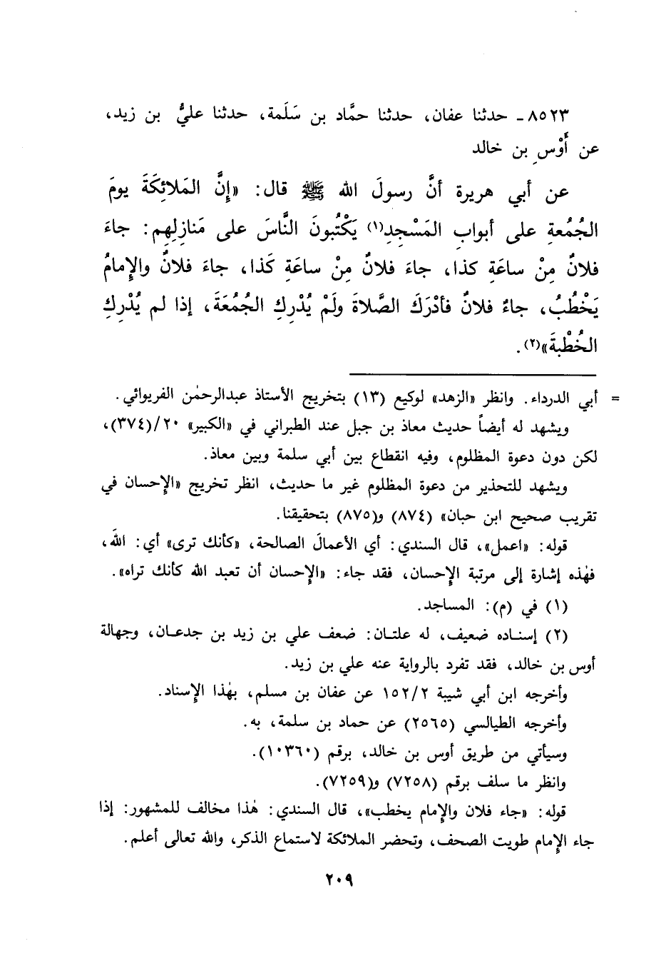 ٨٥٢٣ - حَدَّثَنَا عَفَّانُ، حَدَّثَنَا حَمَّادُ بْنُ سَلَمَةَ، حَدَّثَنَا عَلِيُّ بْنُ زَيْدٍ، عَنْ أَوْسِ بْنِ خَالِدٍ، عَنْ أَبِي هُرَيْرَةَ، أَنَّ رَسُولَ اللهِ صَلَّى اللهُ عَلَيْهِ وَسَلَّمَ، قَالَ: " إِنَّ الْمَلَائِكَةَ يَوْمَ الْجُمُعَةِ عَلَى أَبْوَابِ الْمَسَجِدِ (١) ، يَكْتُبُونَ النَّاسَ عَلَى مَنَازِلِهِمْ، جَاءَ فُلَانٌ مِنْ سَاعَةِ كَذَا، جَاءَ فُلَانٌ مِنْ سَاعَةِ كَذَا، جَاءَ فُلَانٌ وَالْإِمَامُ يَخْطُبُ، جَاءَ فُلَانٌ فَأَدْرَكَ الصَّلَاةَ وَلَمْ يُدْرِكِ الْجُمُعَةَ، إِذَا لَمْ يُدْرِكِ الْخُطْبَةَ " (٢)