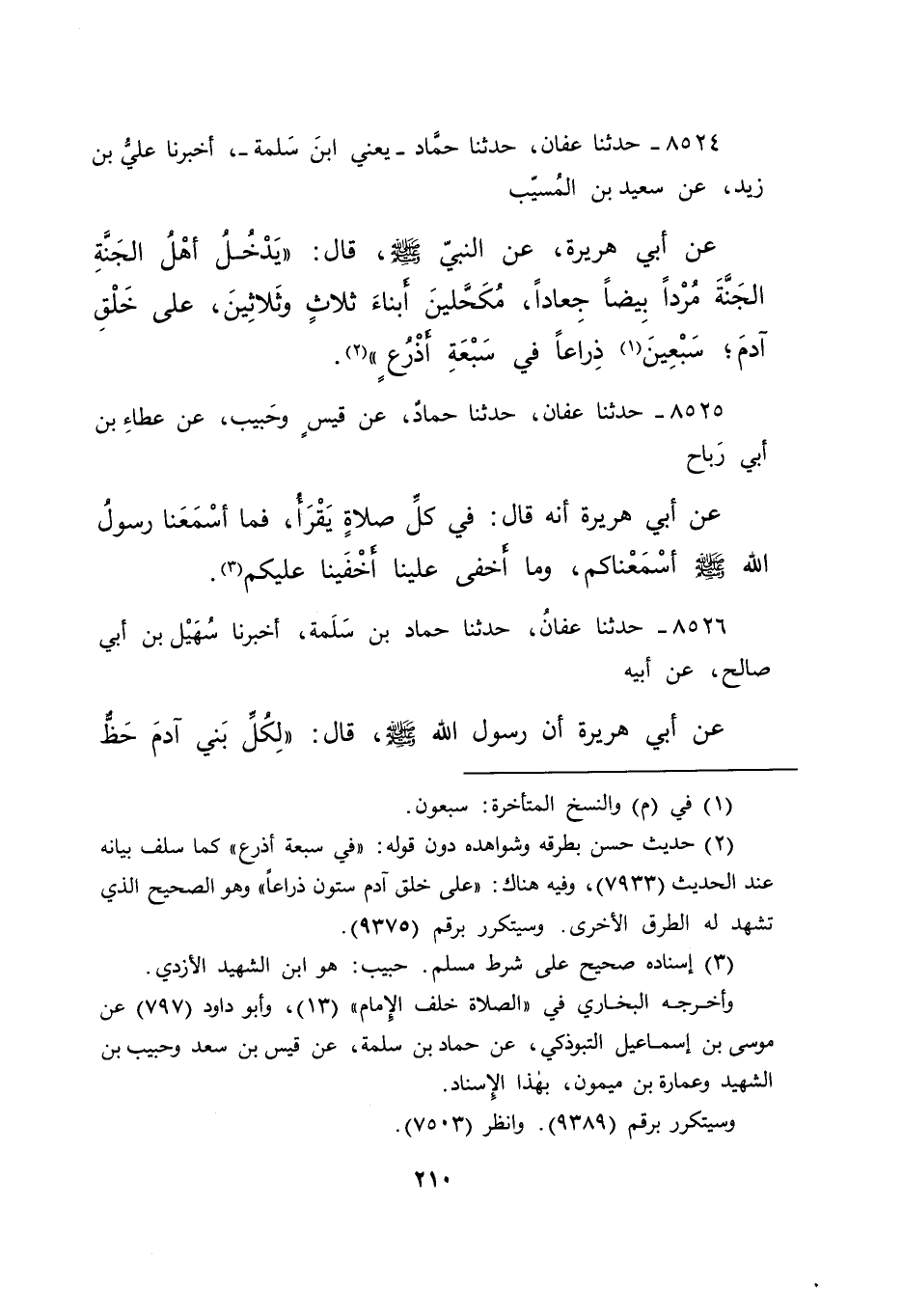 ٨٥٢٤ - حَدَّثَنَا عَفَّانُ، حَدَّثَنَا حَمَّادٌ يَعْنِي ابْنَ سَلَمَةَ، أَخْبَرَنَا عَلِيُّ بْنُ زَيْدٍ، عَنْ سَعِيدِ بْنِ الْمُسَيِّبِ، عَنْ أَبِي هُرَيْرَةَ، عَنِ النَّبِيِّ صَلَّى اللهُ عَلَيْهِ وَسَلَّمَ، قَالَ: " يَدْخُلُ أَهْلُ الْجَنَّةِ الْجَنَّةَ مُرْدًا بِيضًا جِعَادًا مُكَحَّلِينَ، أَبْنَاءَ ثَلَاثٍ وَثَلَاثِينَ، عَلَى خَلْقِ آدَمَ، سَبْعِينَ (١) ذِرَاعًا فِي سَبْعَةِ أَذْرُعٍ " (٢)